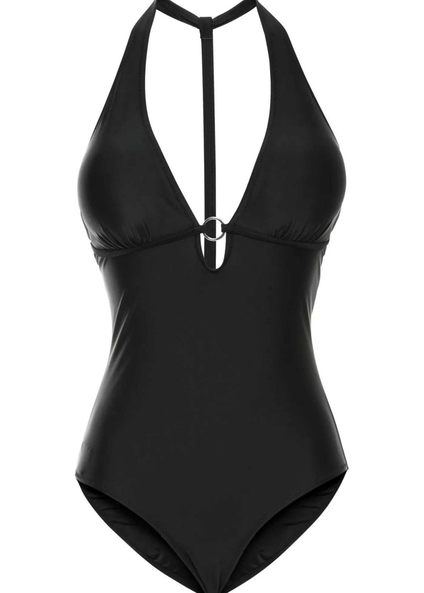 Bañador femenino con escote profundo. Con un escote muy pronunciado en la parte delantera y trasera. Copas blandas desmontables. Con una abertura en la parte posterior.