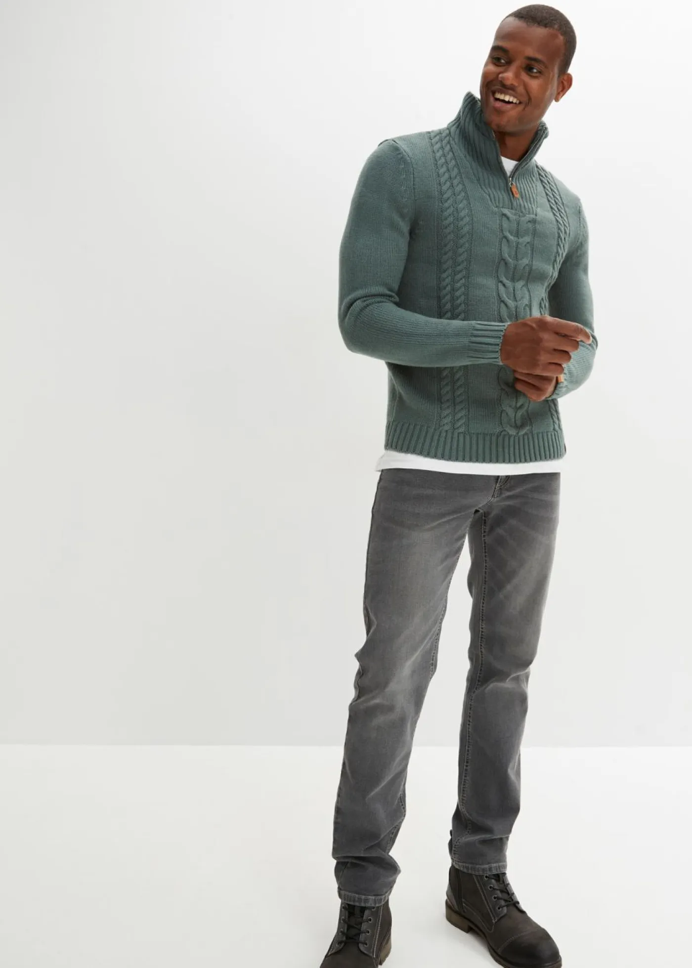 Moderno jersey con patrón trenzado y bonitos detalles de piel sintética. Se puede lavar a máquina.