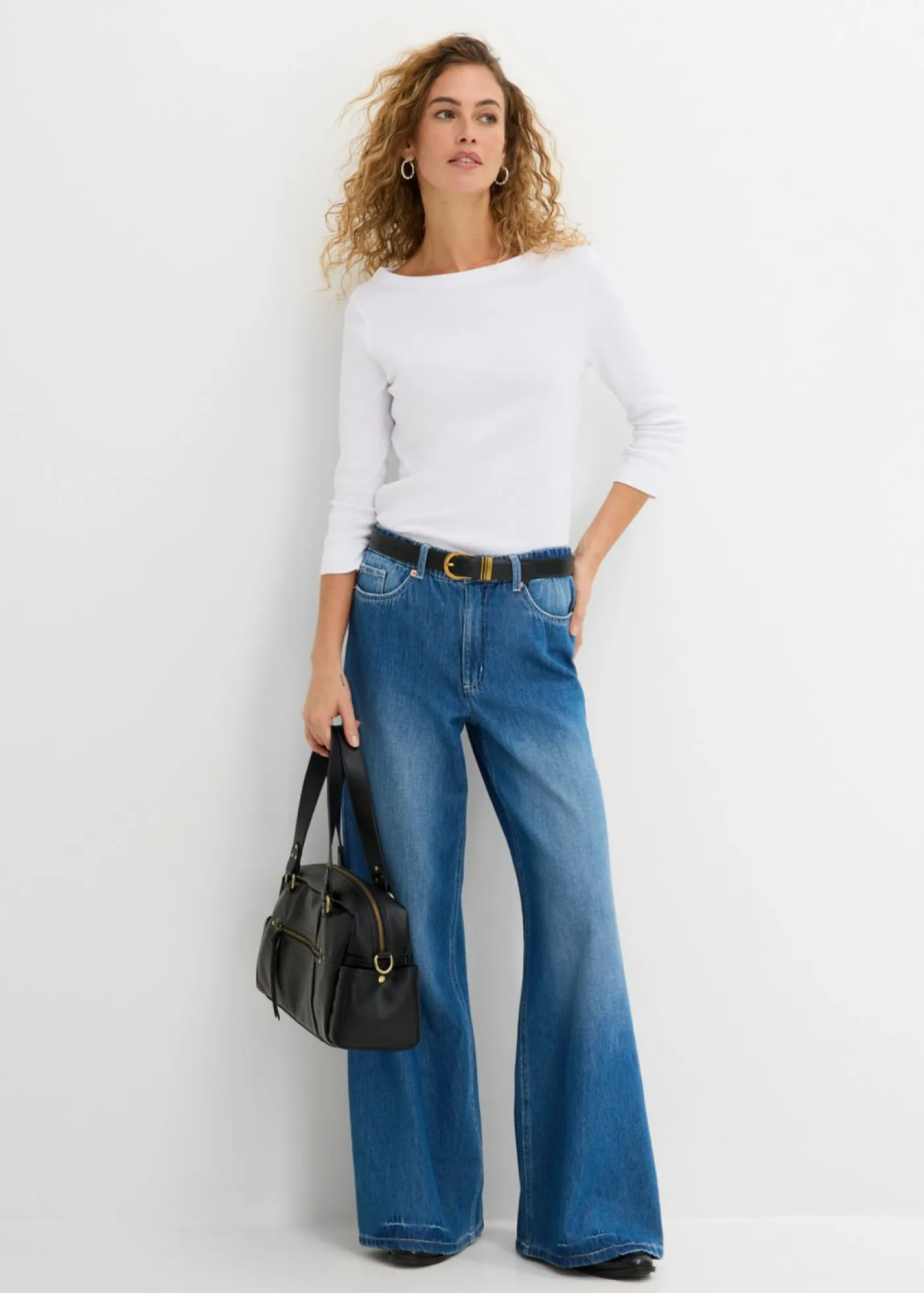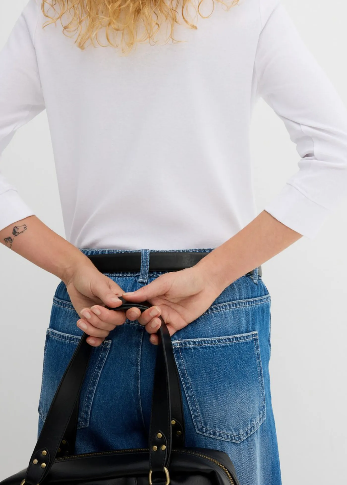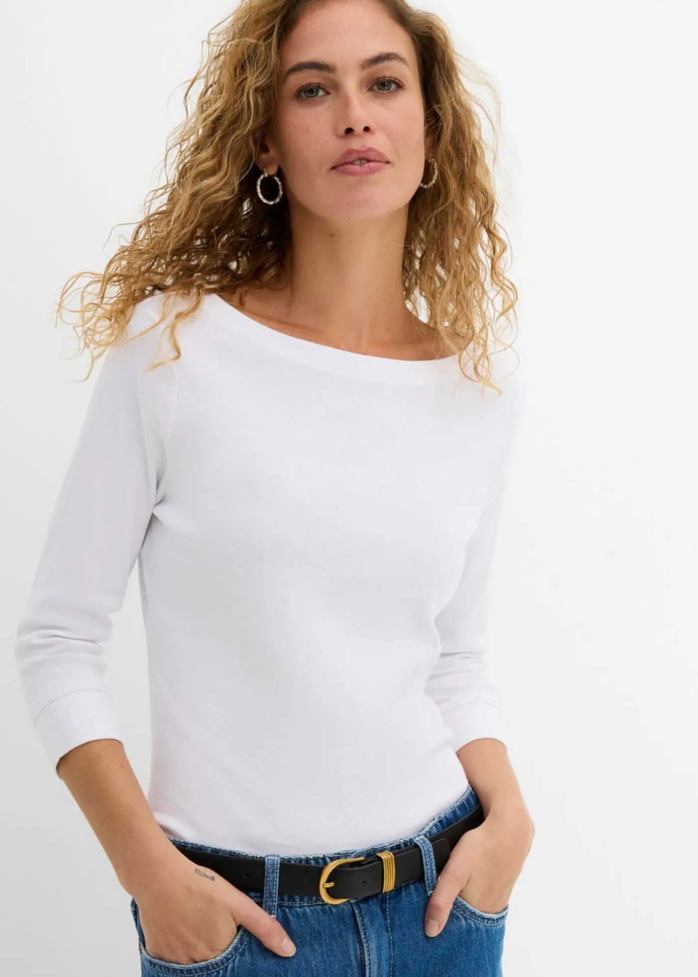 Cómoda camiseta elástica con mangas 374 y escote en U. Largo de aprox. 64 cm (talla 36/38) a aprox. 72 cm (talla 52/54). Se puede lavar a máquina.