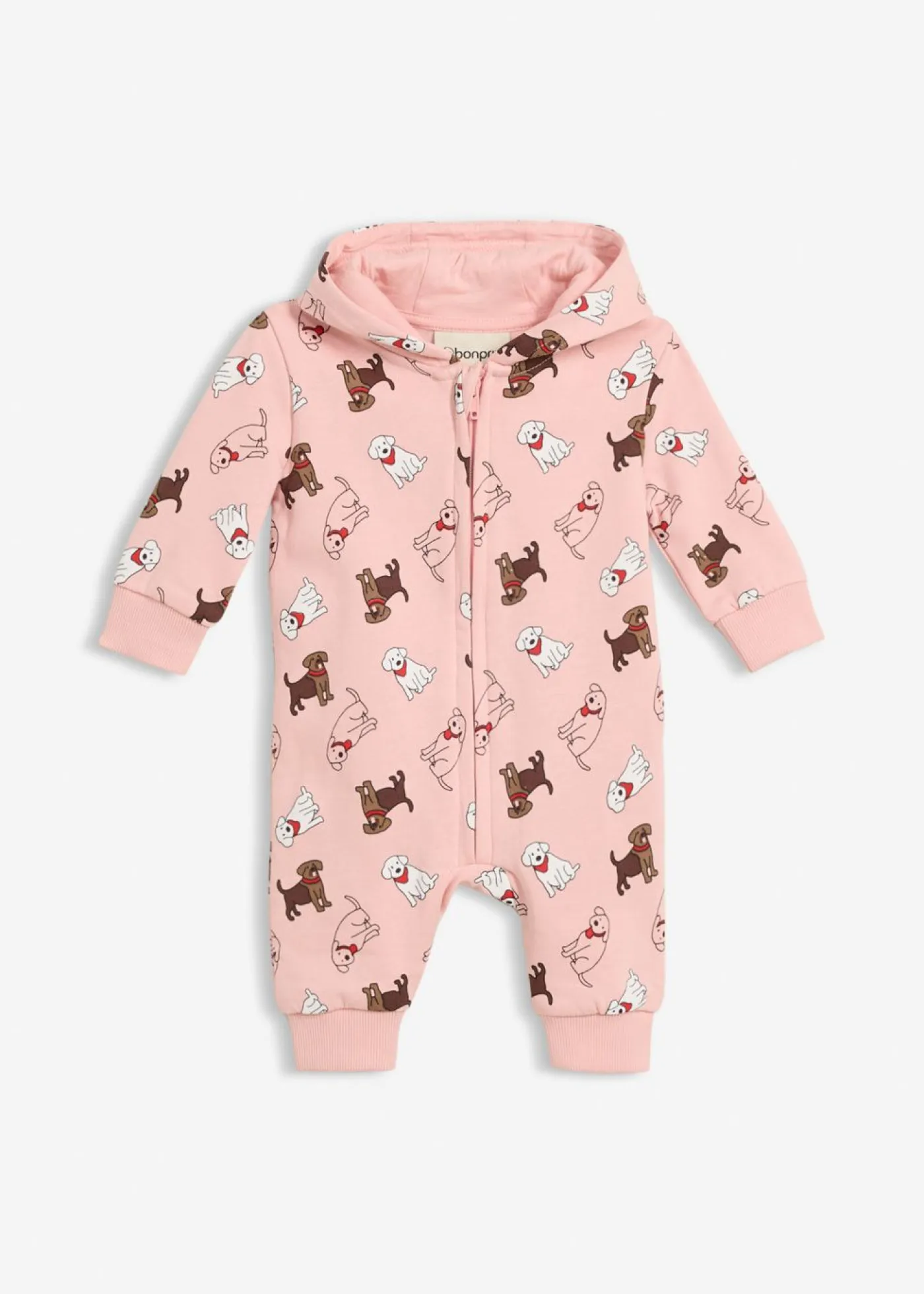 Mono con un bonito estampado de perros salchicha y cremallera para bebés. Confeccionado en felpa de algodón orgánico con un interior cepillado muy suave. Con capucha y cremallera completa con protección para la barbilla. Los suaves puños de canalé se ajustan a las muñecas y los tobillos del bebé.