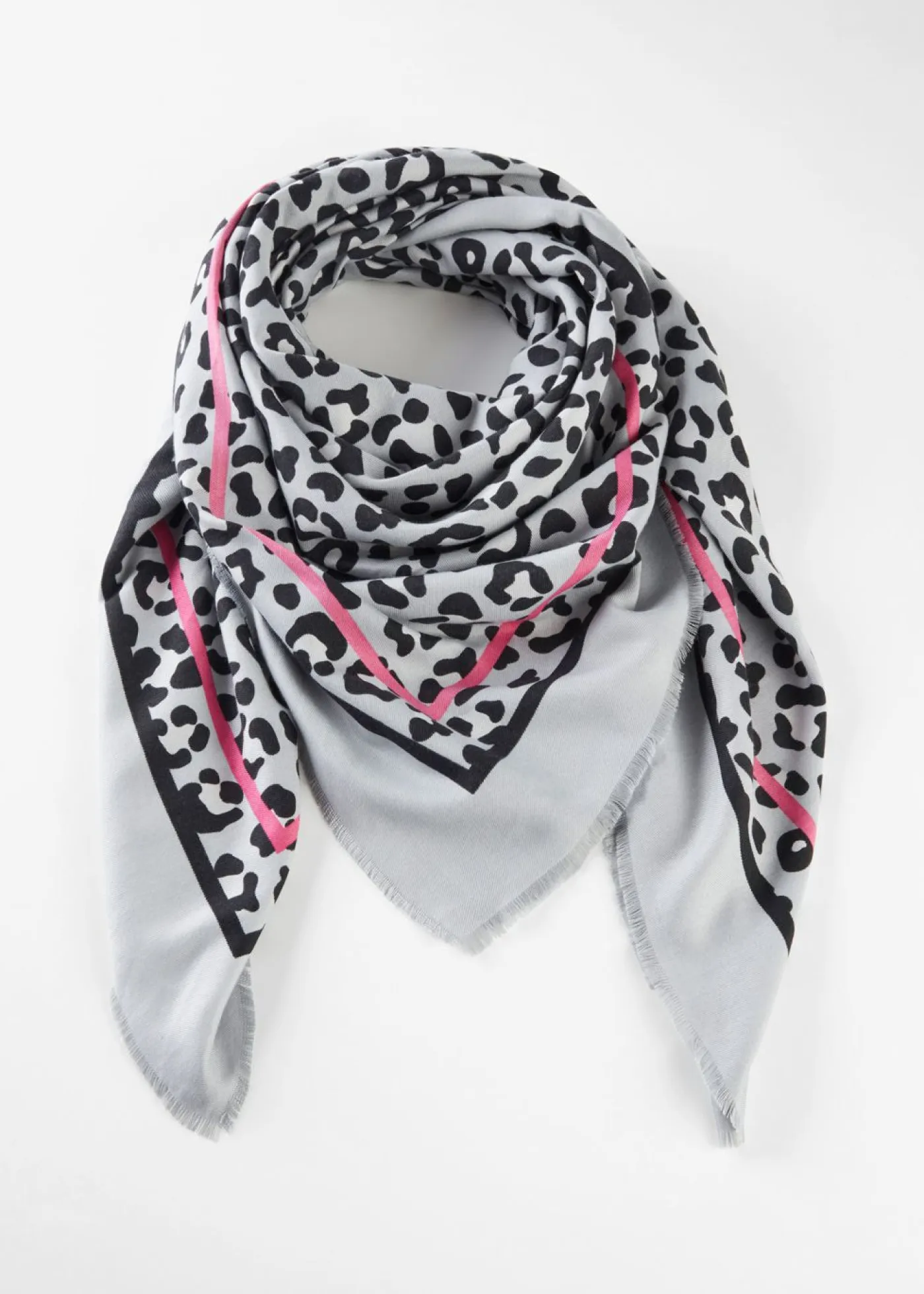 Pañuelo moderno con estampado de leopardo. Bonito pañuelo con patrón de leopardo y bordes de color en contraste, hecha de un material suave.