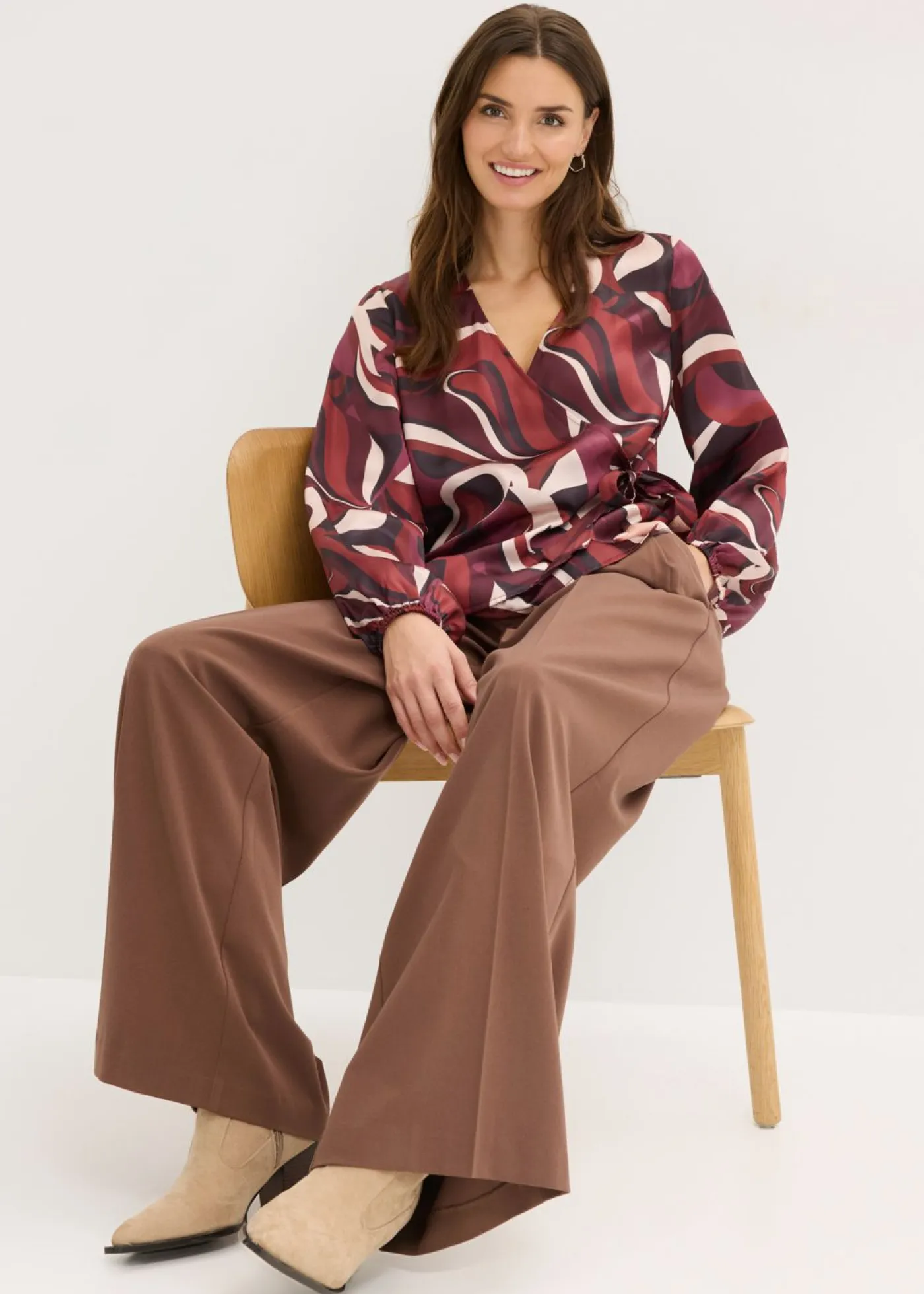 Blusa de satén vaporoso con estampado de moda y cierre de lazo en el interior y el exterior.