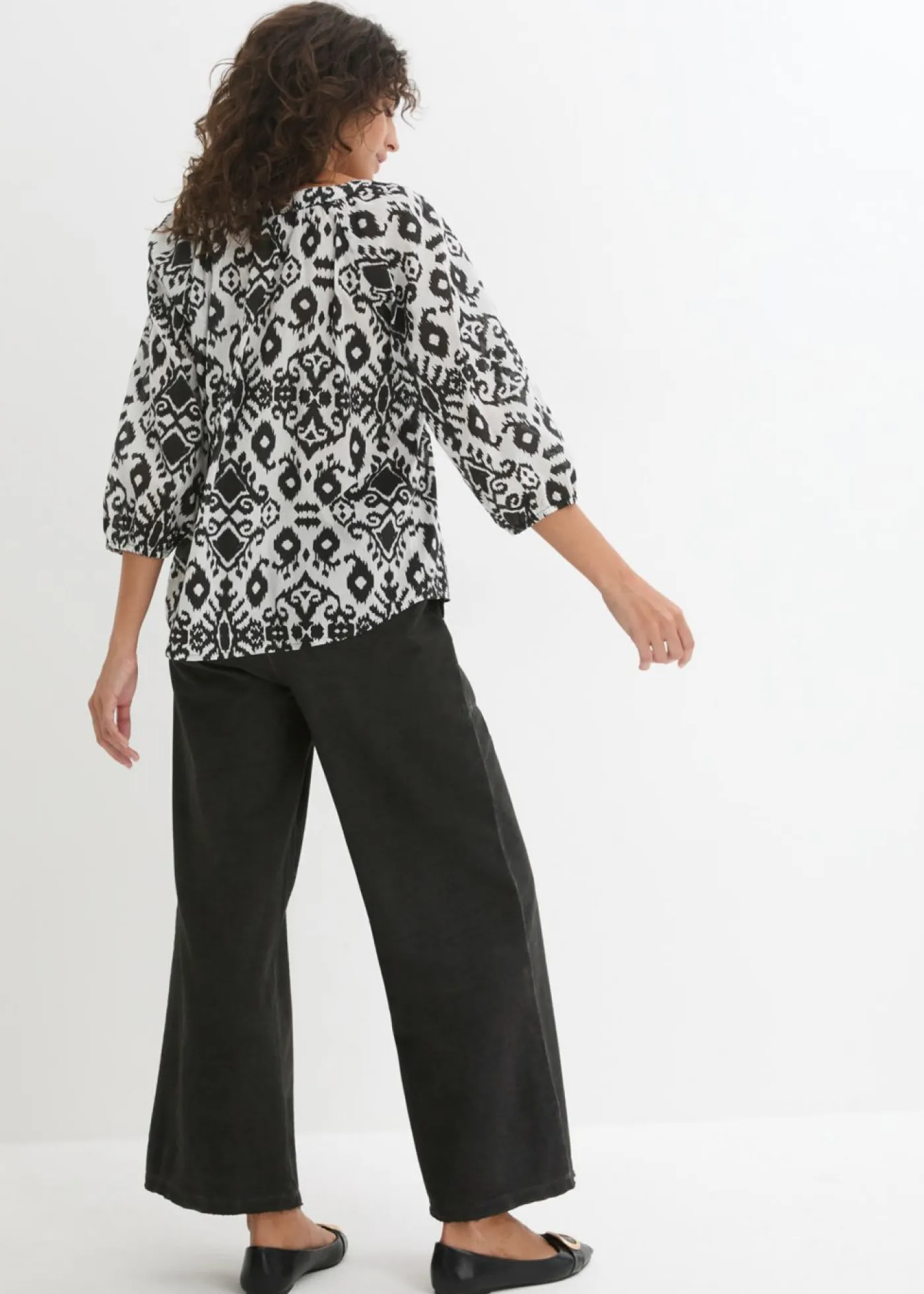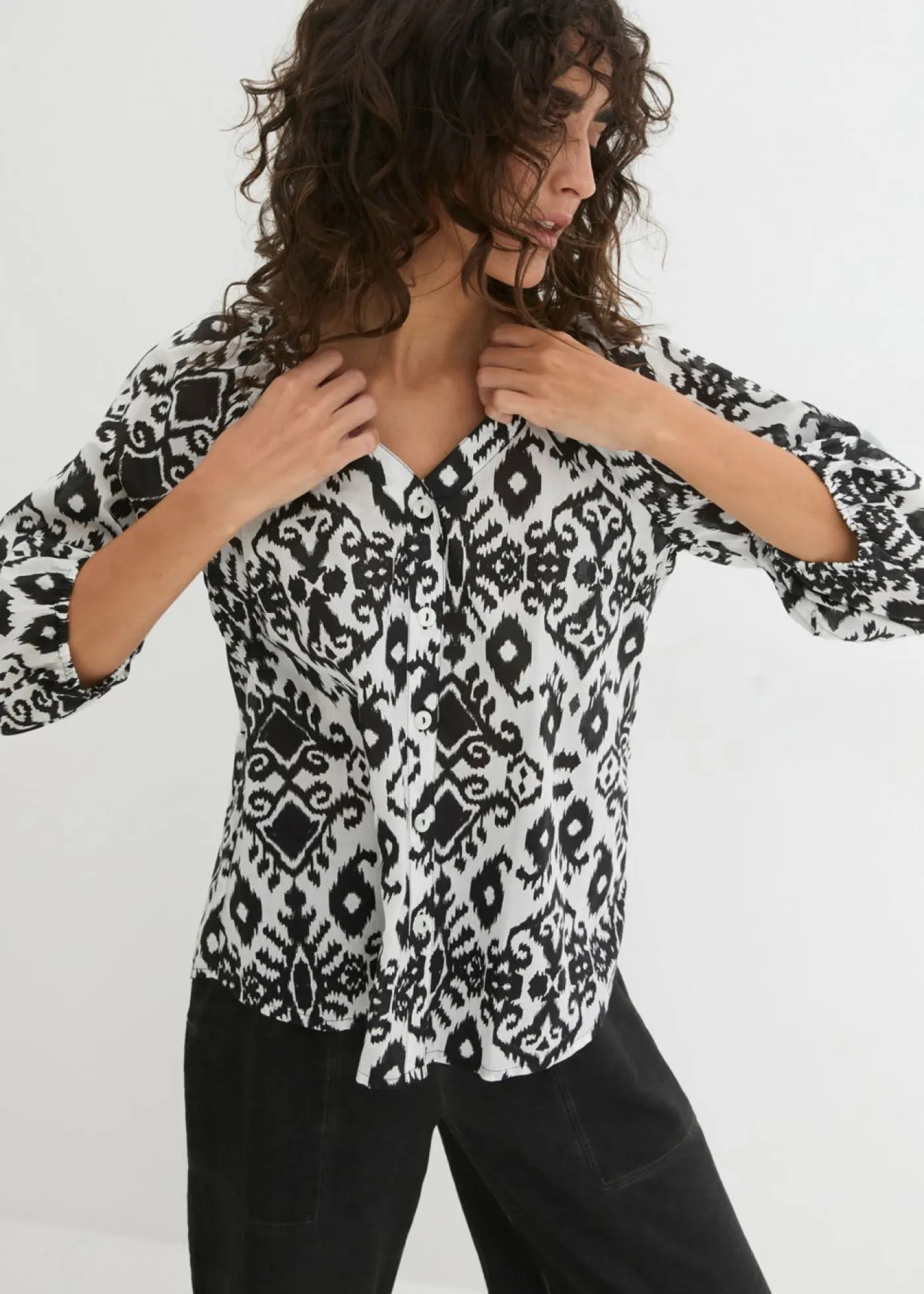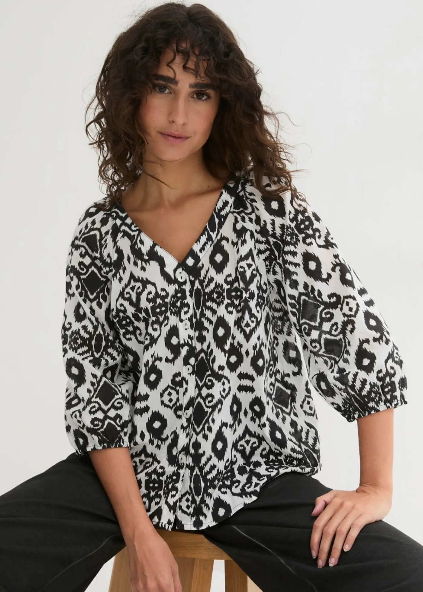 Blusa de algodón estampada con mangas 3/4. Largo de aprox. 63,5 cm en talla 42. Se puede lavar a máquina.
