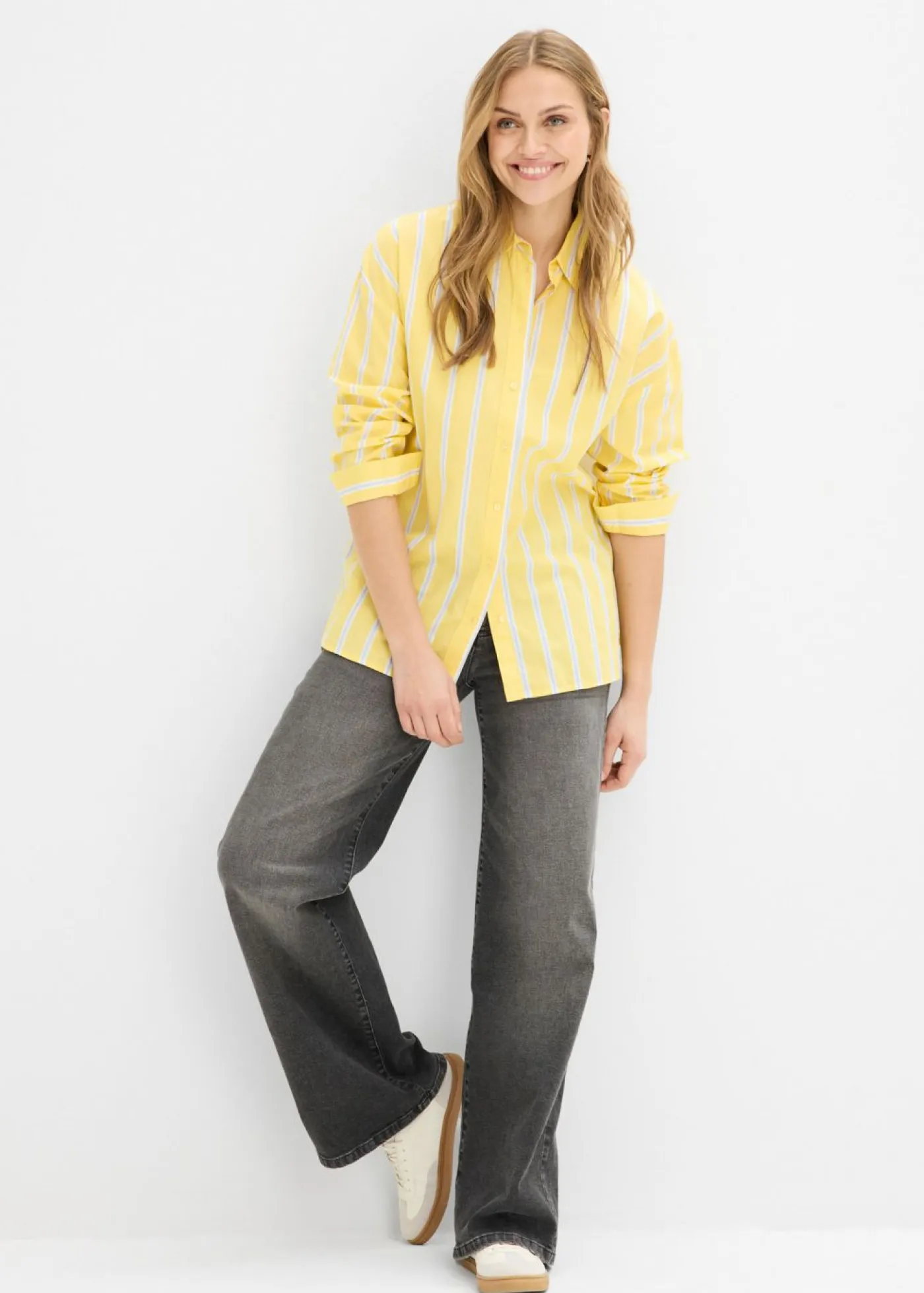 Blusa oversize de manga larga, con botones y cuello clásico. Con detalle ajustable en la espalda para regular el ancho. Largo de aprox. 56 cm en talla 42. Se puede lavar a máquina.