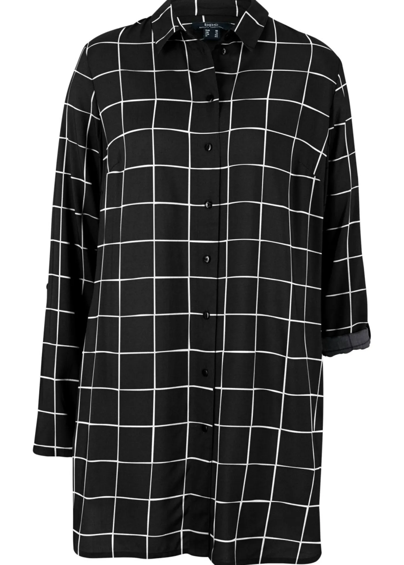 La blusa larga de cuadros con una botonera continua favorece a cualquier tipo de figura. Largo de aprox. 74 cm (talla 38) a 83cm (talla 56). Se puede lavar a máquina.
