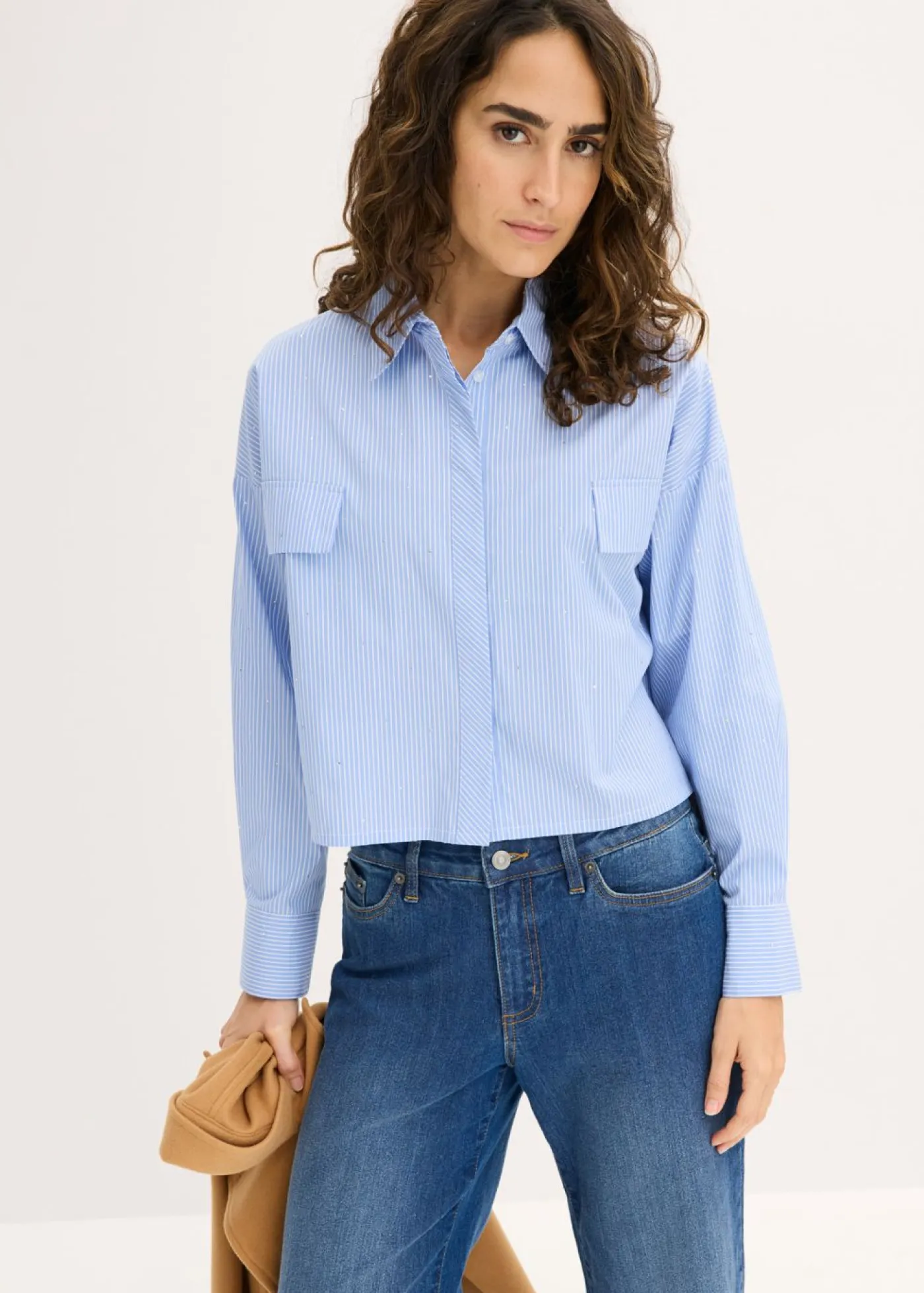 Blusa corta con diseño de rayas y solapas superpuestas.