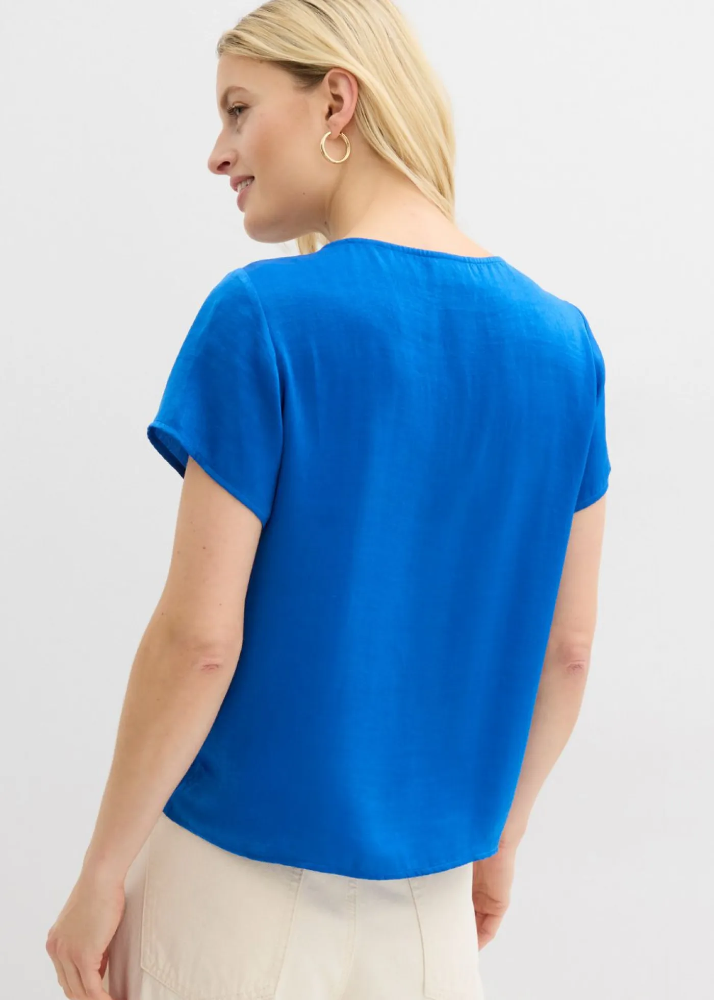 Túnica elegante de satén con mangas cortas y detalle decorativo de metal.