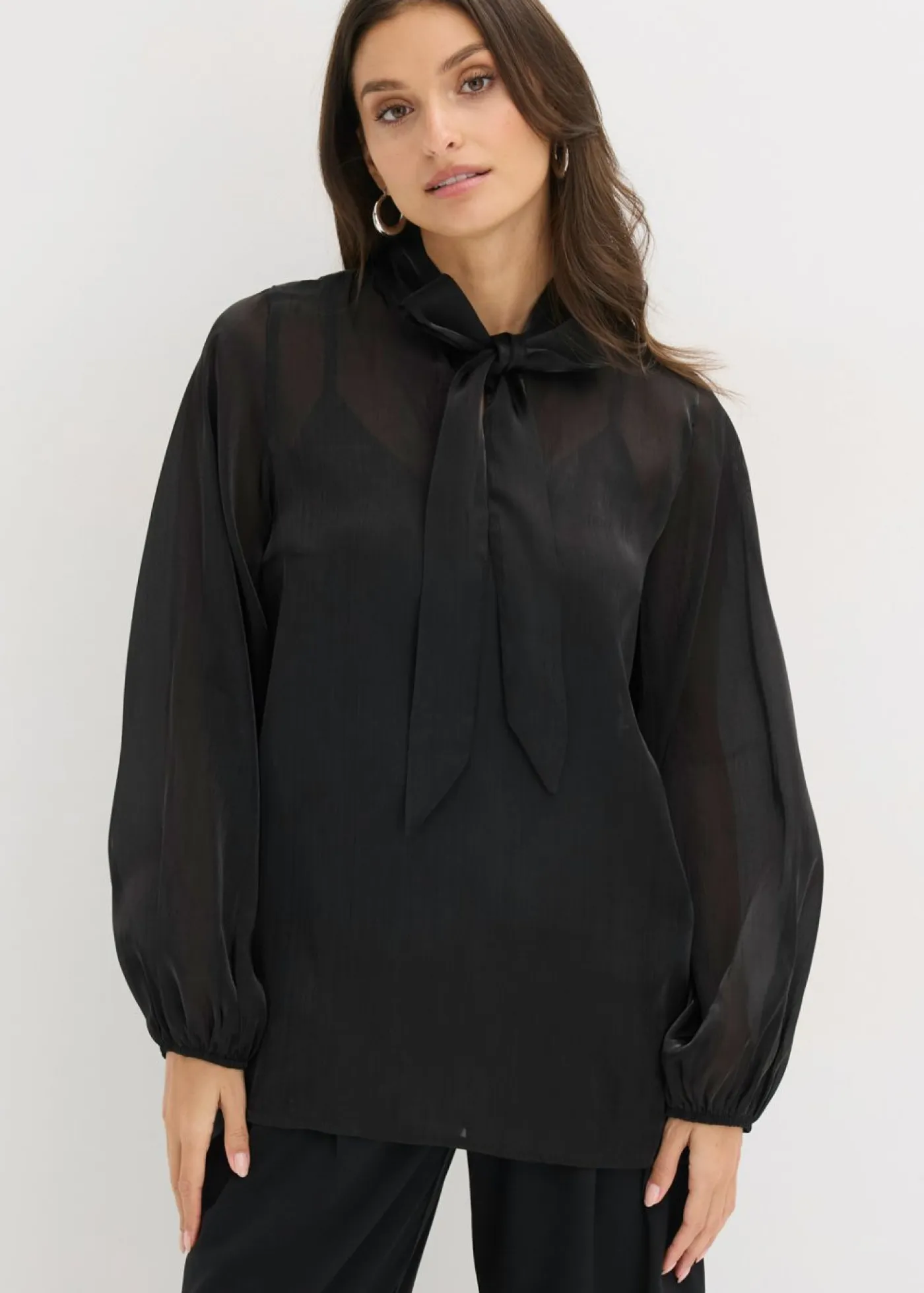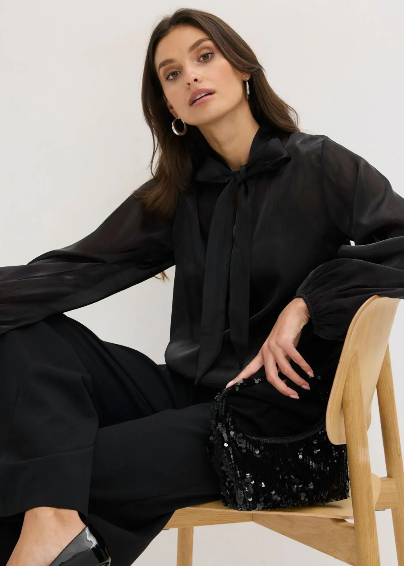 Moderno y femenino: Blusa con lazo de tul brillante con detalle de lazo en el cuello.