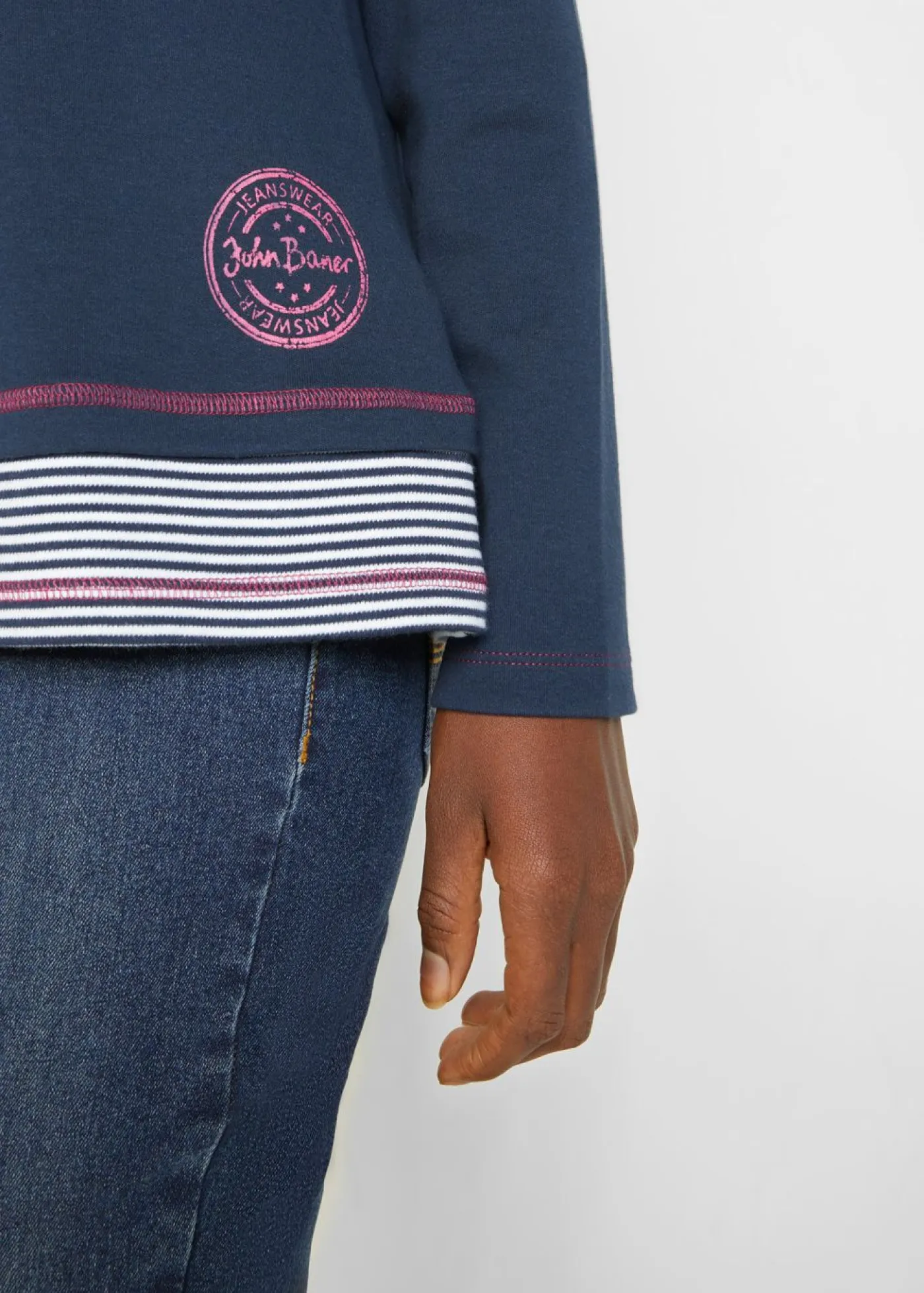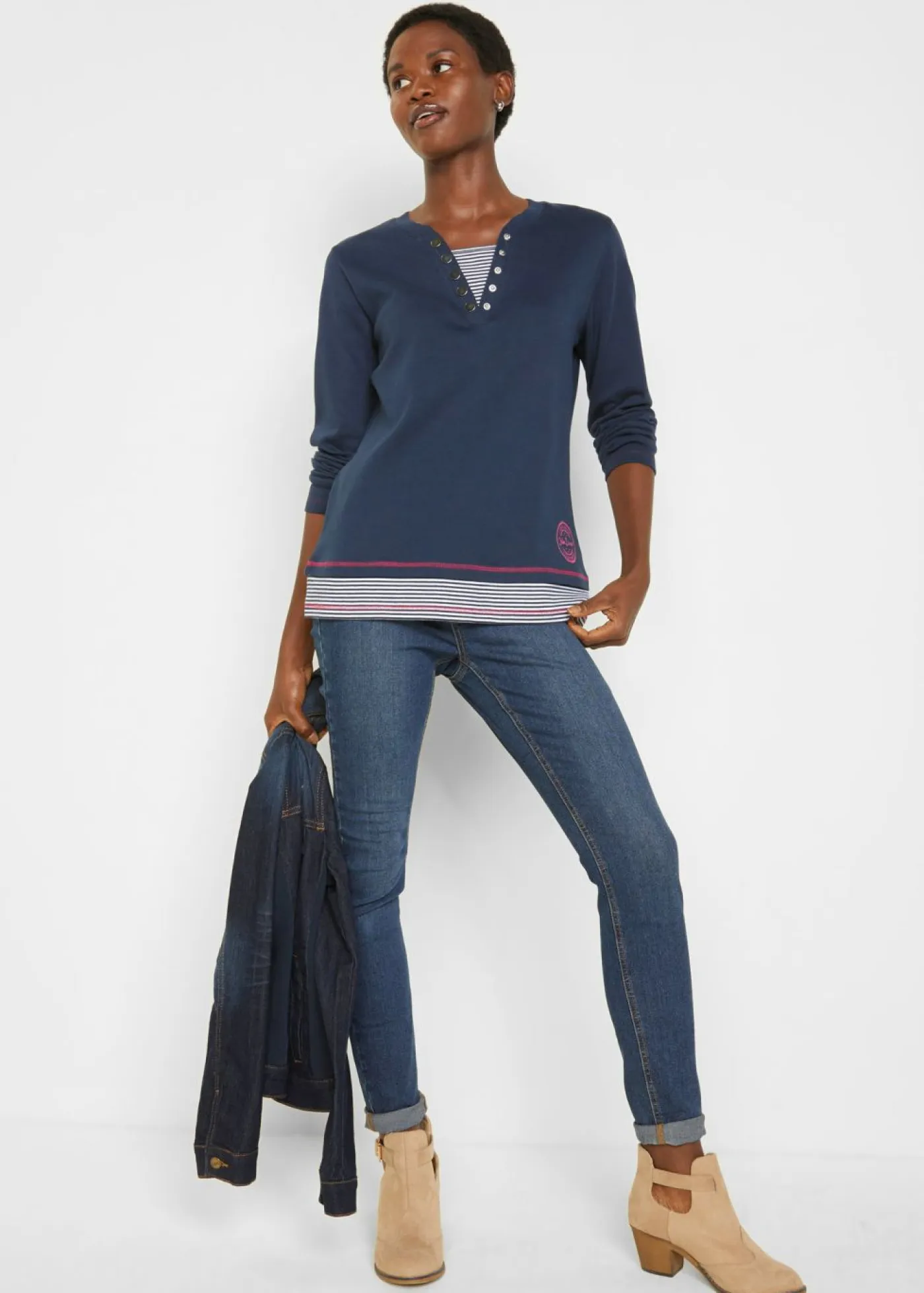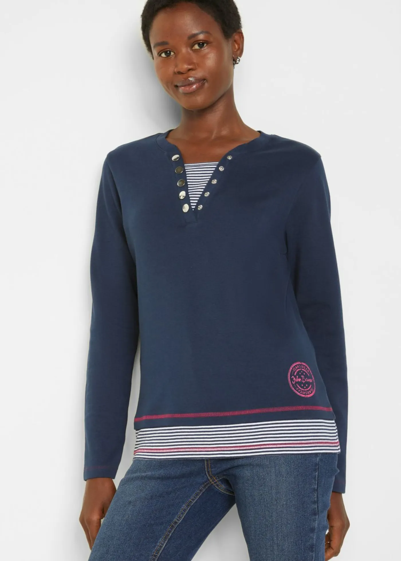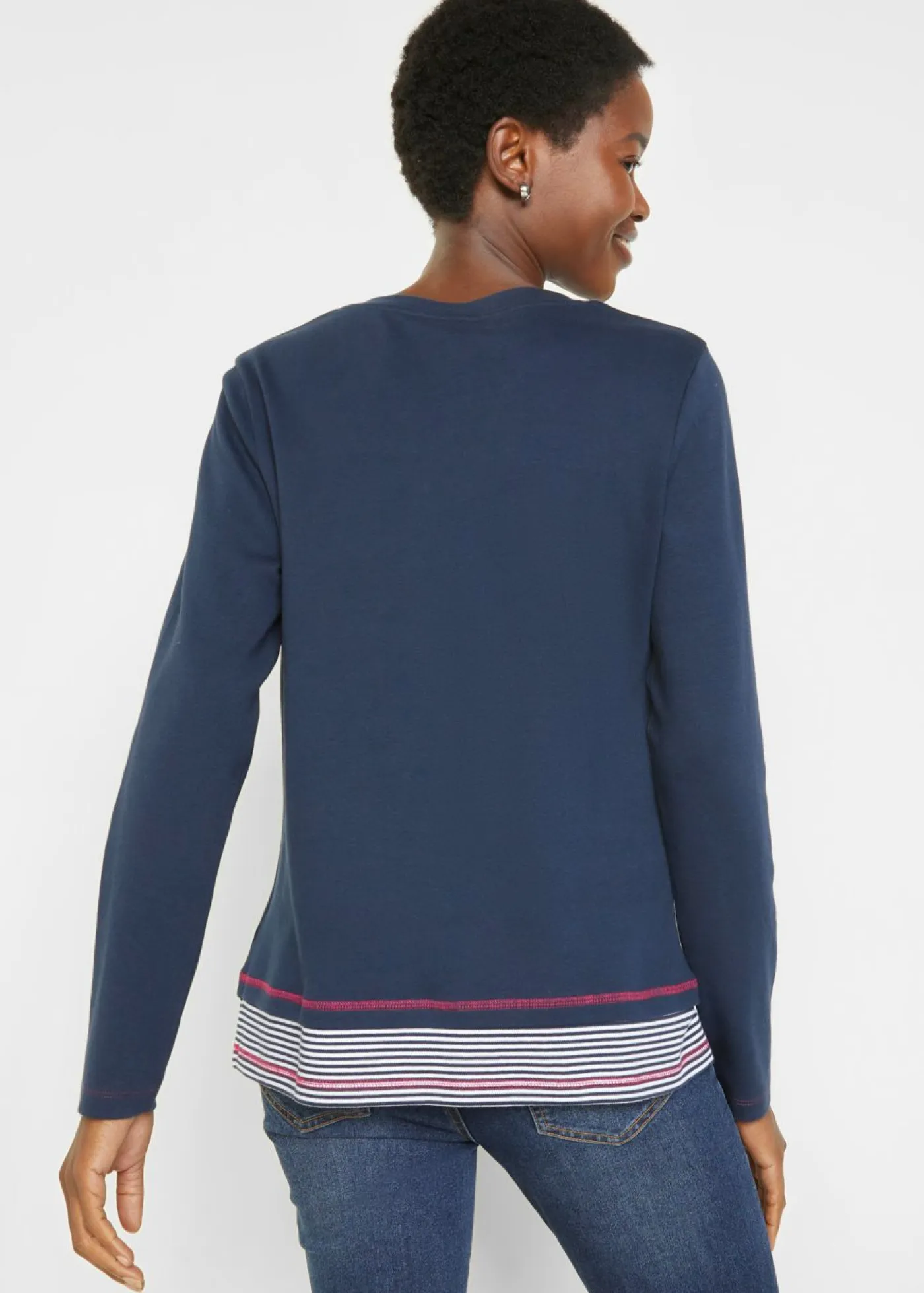 Camiseta de manga larga de algodón, marinera, look 2 en 1. Largo total de aprox. 66 cm en talla 40/42. Se puede lavar a máquina.