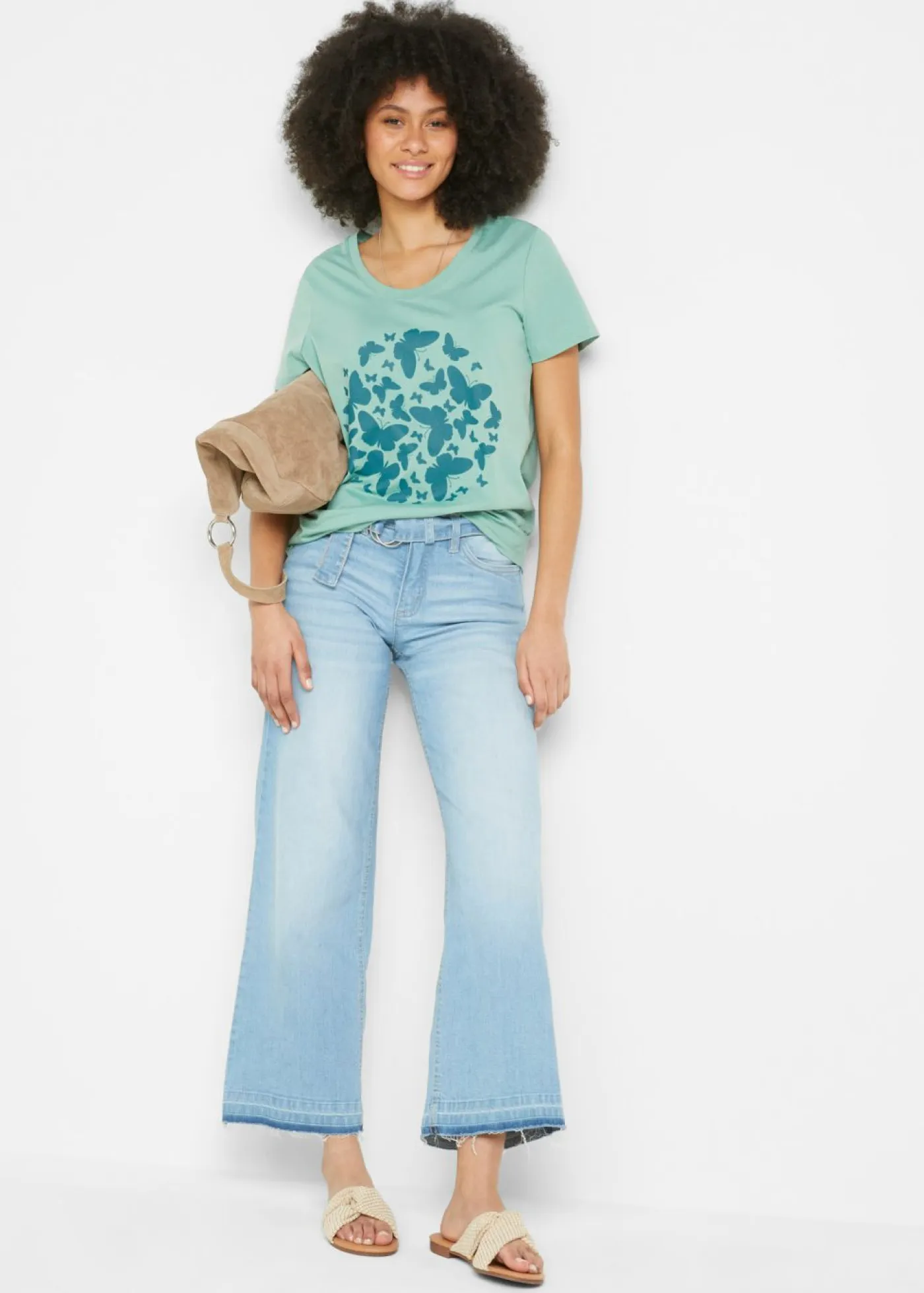 Camiseta de manga corta con estampado de mariposa. Largo total de aprox. 66 cm en talla 40/42. Se puede lavar a máquina.