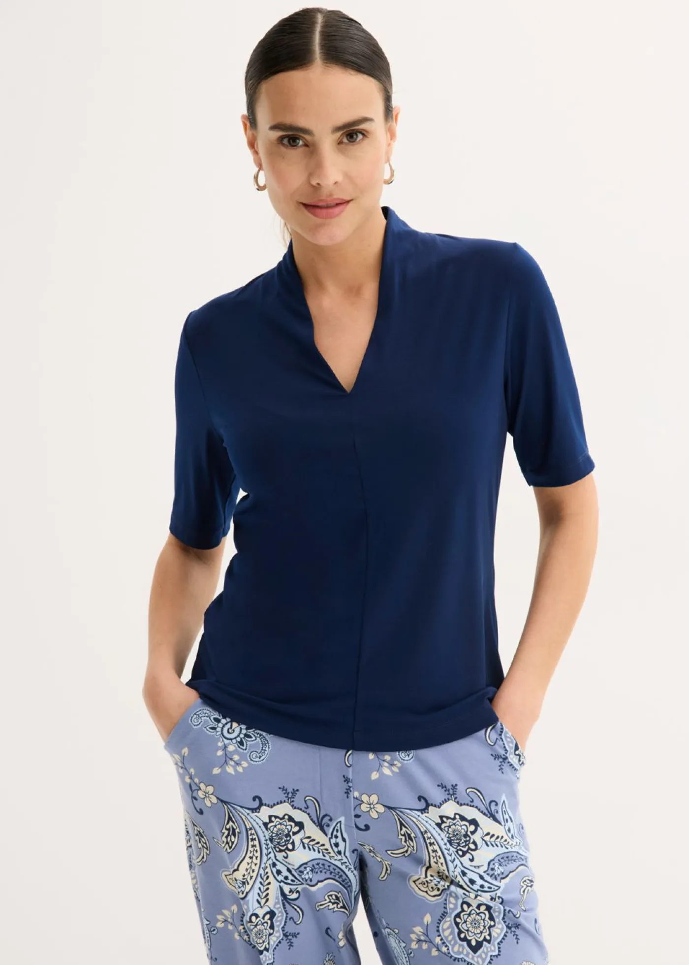 Elegante camiseta con cuello chimenea y escote en V.