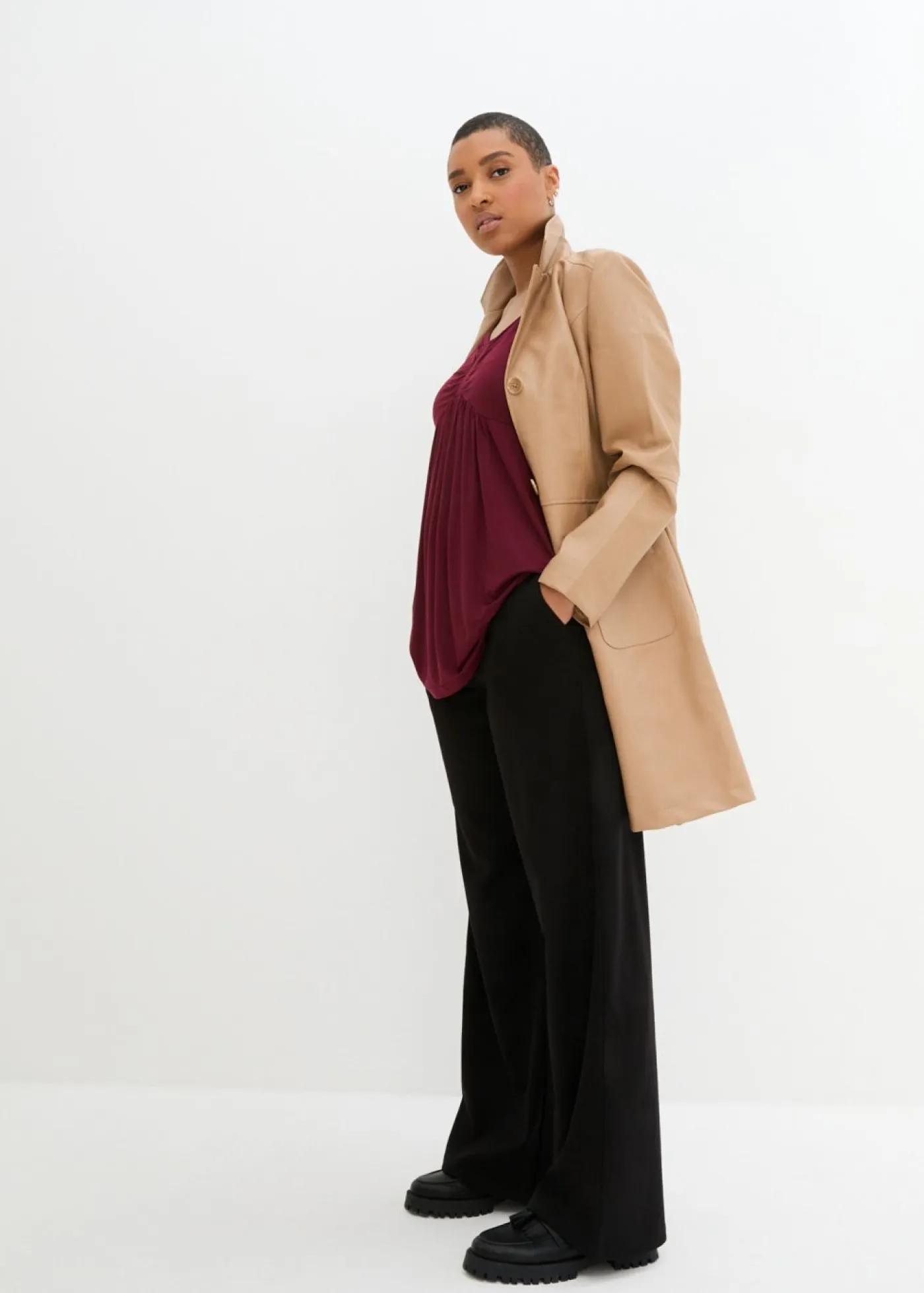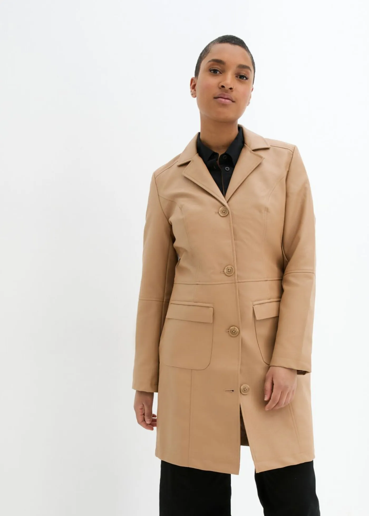 Abrigo moderno de piel sintética. Largo de aprox. 90 cm en todas las tallas. Se puede lavar a máquina.