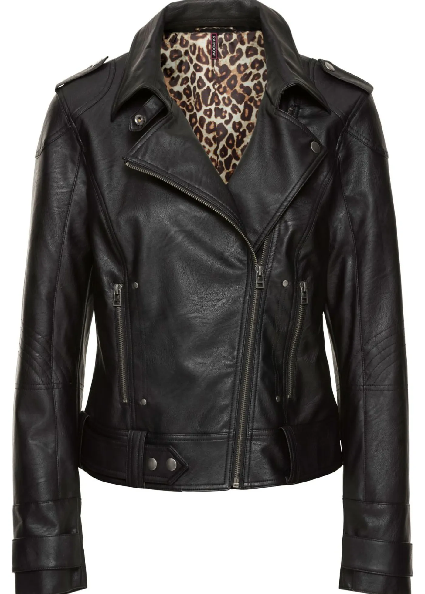 Chaqueta informal de piel sintética con forro de leopardo. De piel sintética con bucles, remaches y botones de presión. Con cremallera inclinada y bolsillos en la parte delantera. El forro de leopardo. Largo total de 54 cm aprox. en talla 38.