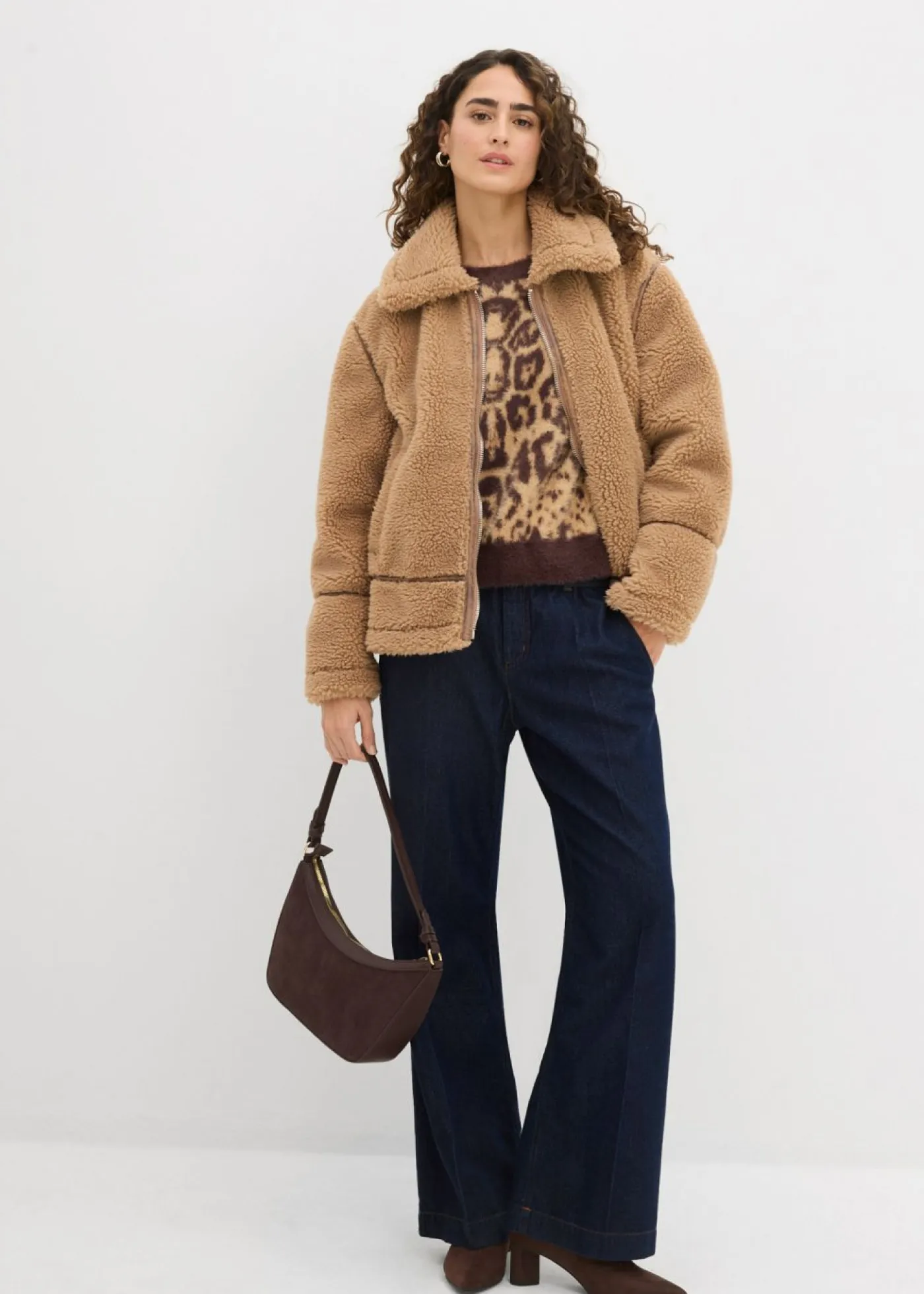 Chaqueta de borrego sintético con detalles de cuero.