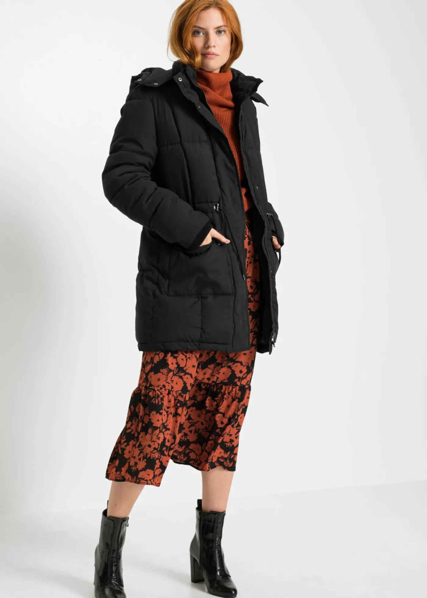 Cálida chaqueta con capucha y bolsillos. Largo de aprox. 82 cm en talla 38.