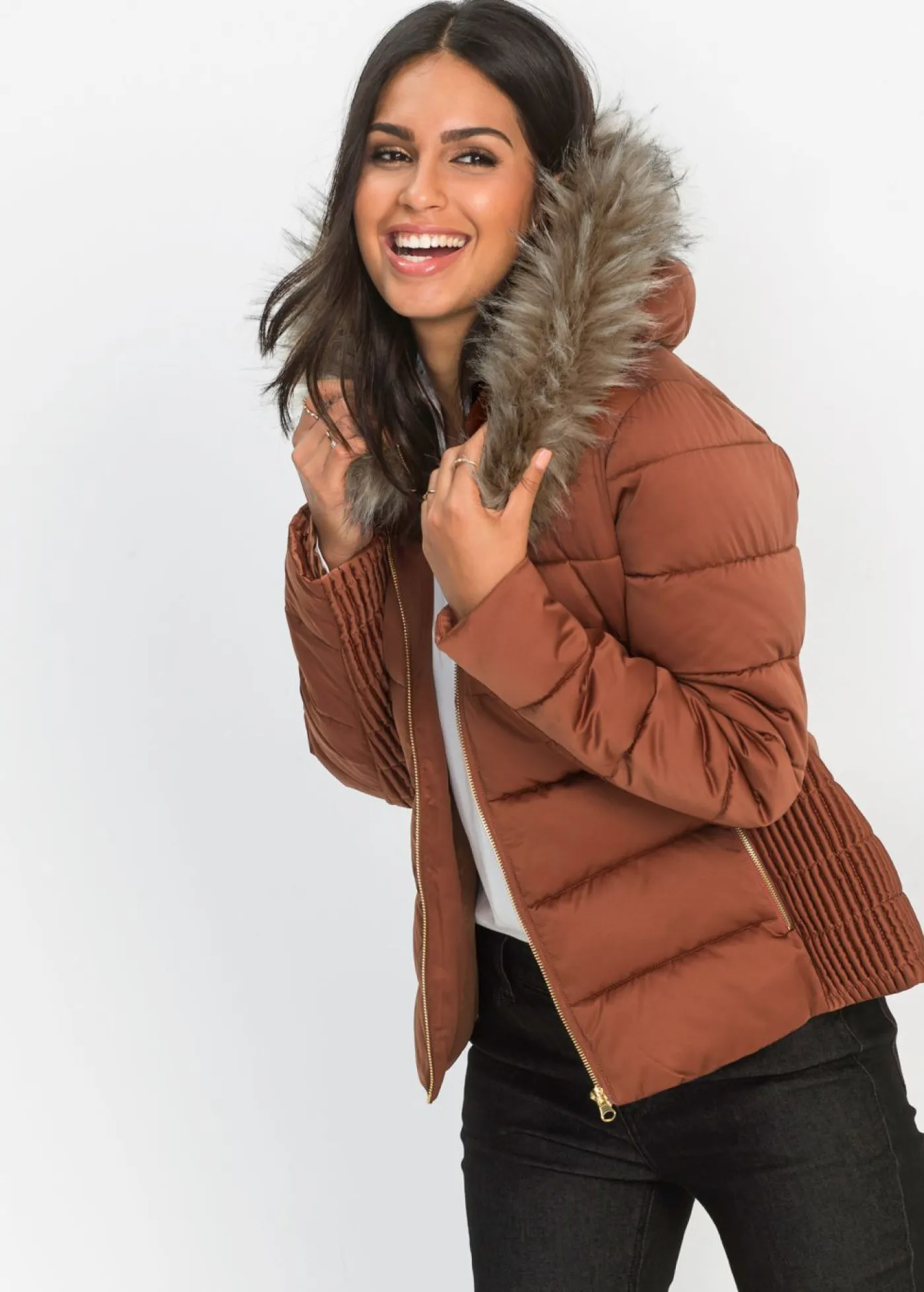 Chaqueta acolchada femenina con capucha de piel sintética y fruncidos. Esta ligera chaqueta acolchada con capucha tiene un cuello de piel sintética y cremallera metalizada. Al ser entallada, acentúa la figura. Con fruncidos en la cintura y a lo largo de las mangas. Largo de aprox. 59 cm en talla 38.