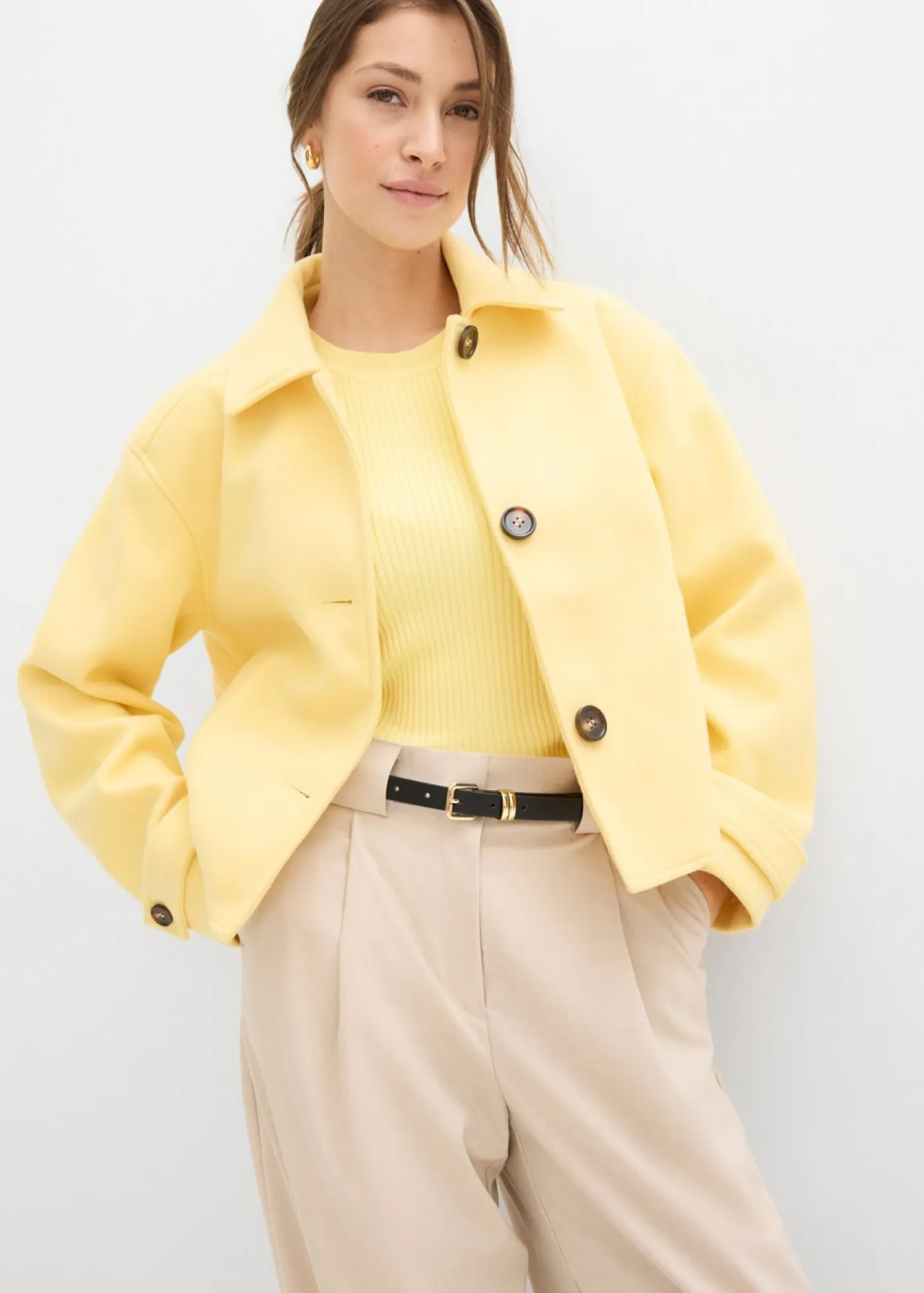 Elegante abrigo corto con aspecto de lana y bolsillos.