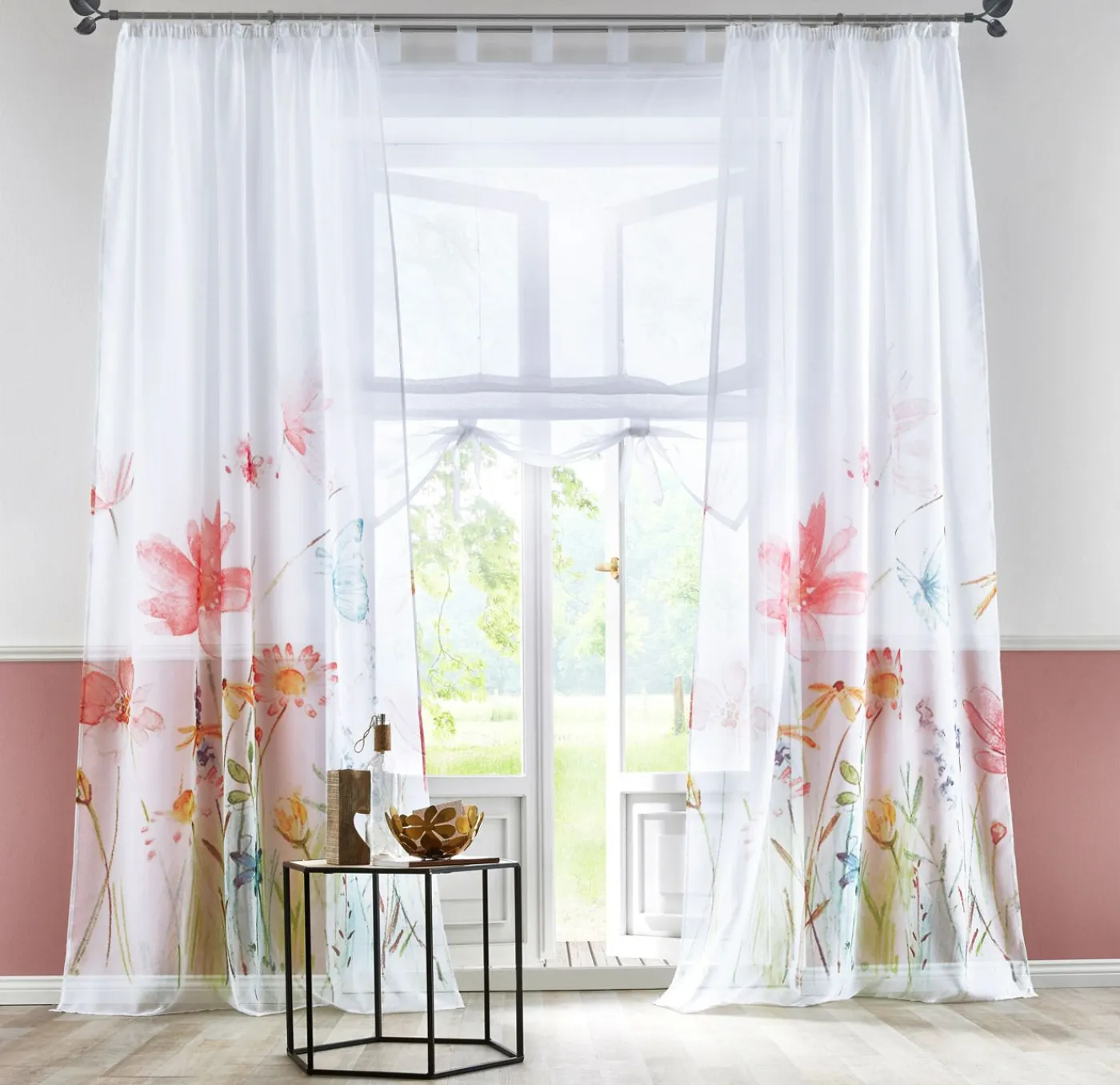 Estor romano de gasa transparente con un sofisticado ribete y bolas de plástico decorativas. Embellece tu ventana en un abrir y cerrar de ojos y proporciona intimidad.
