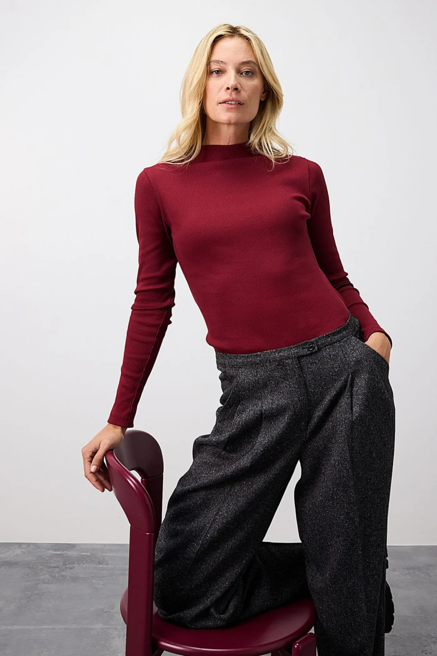 Camiseta ajustada de canalé con cuello alto y mangas largas.