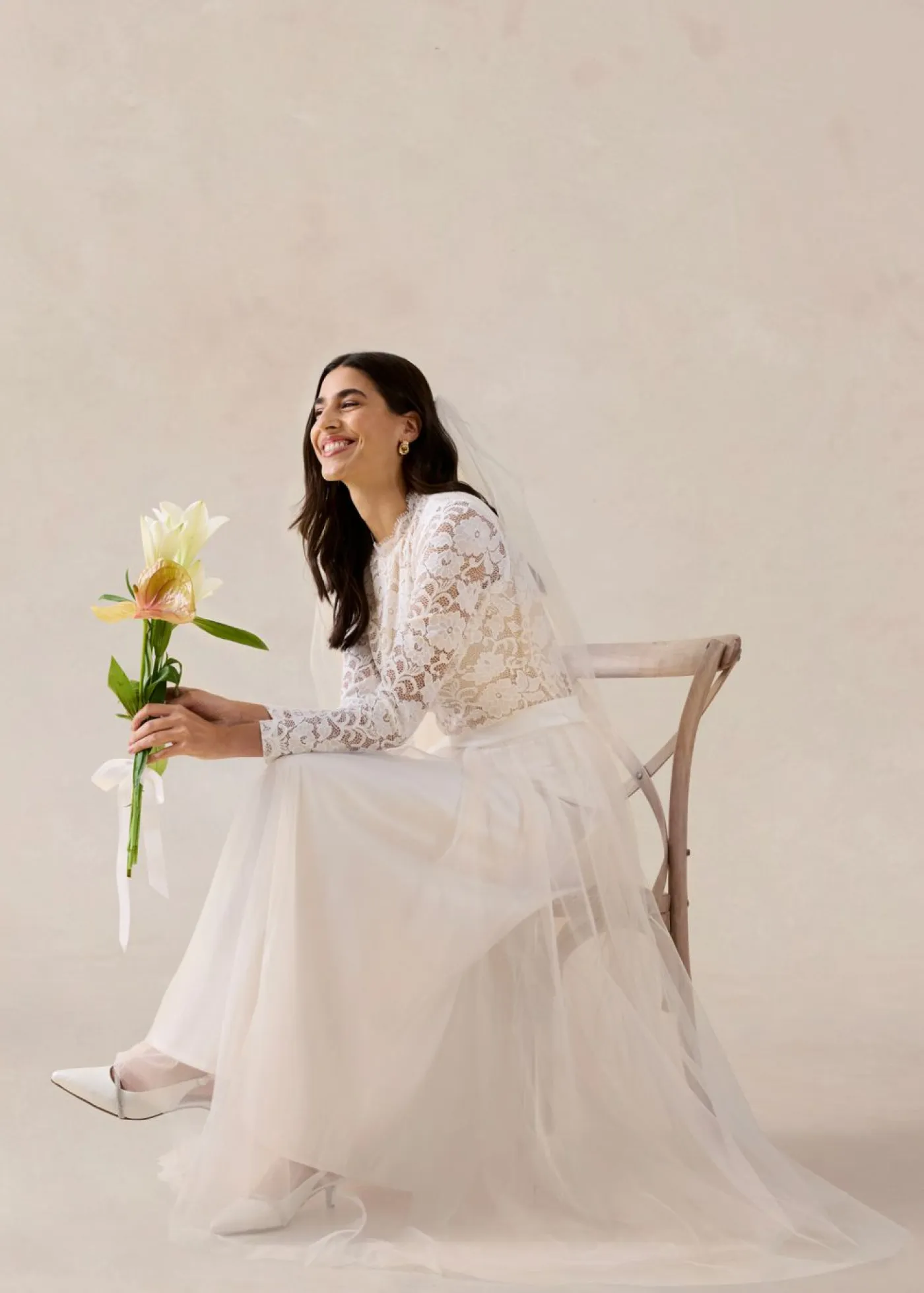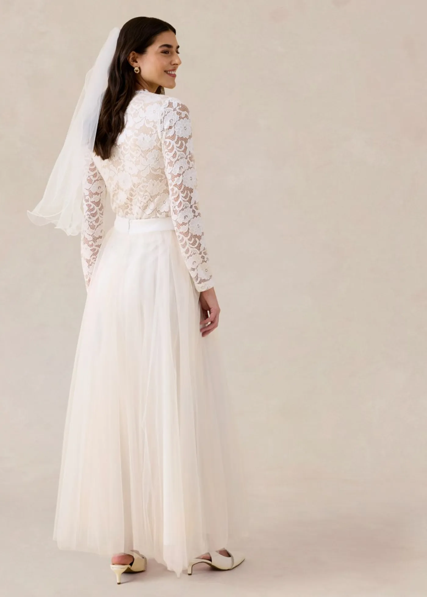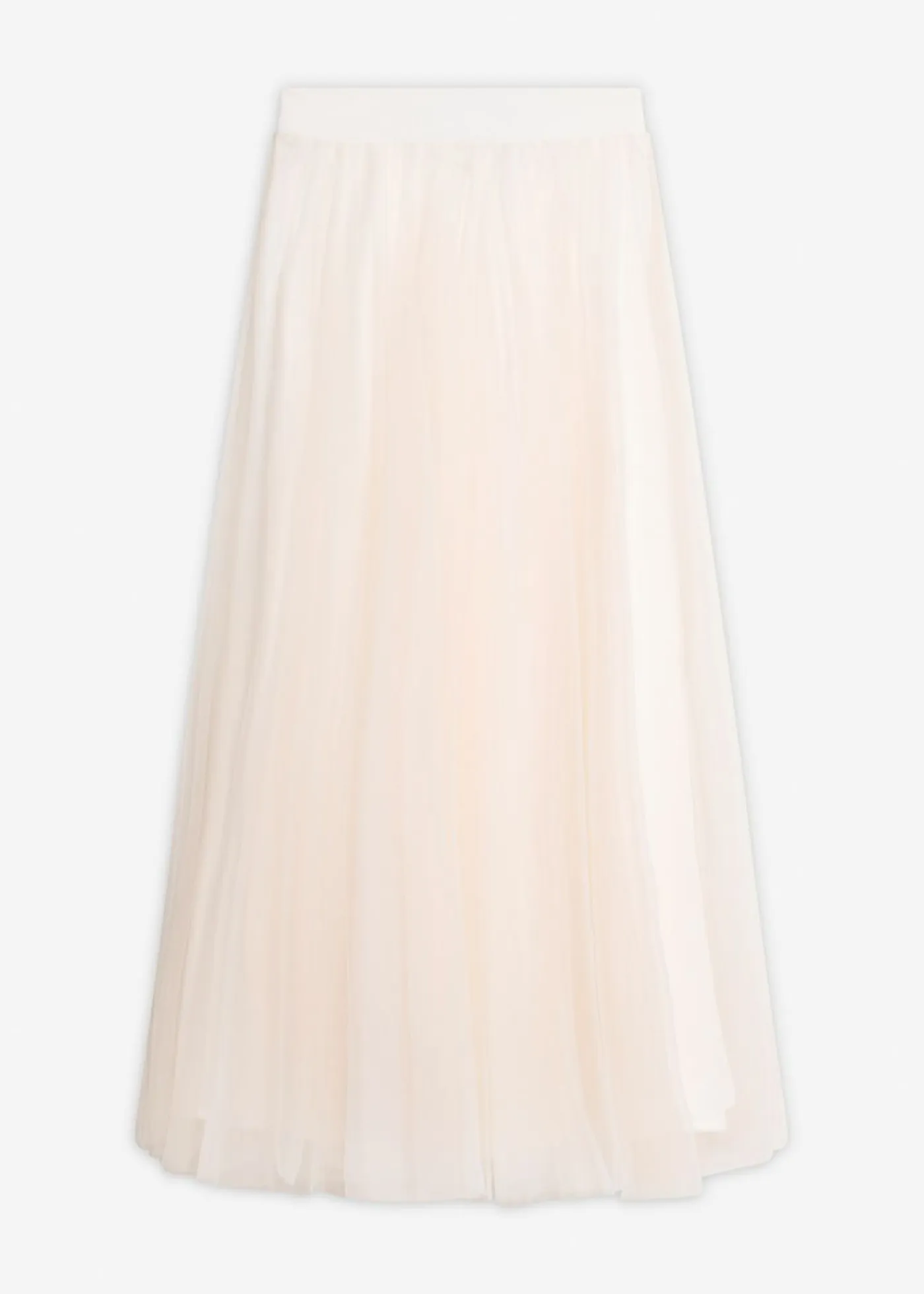 Femenina y romántica: falda larga de tul con capa de tul en color champán.