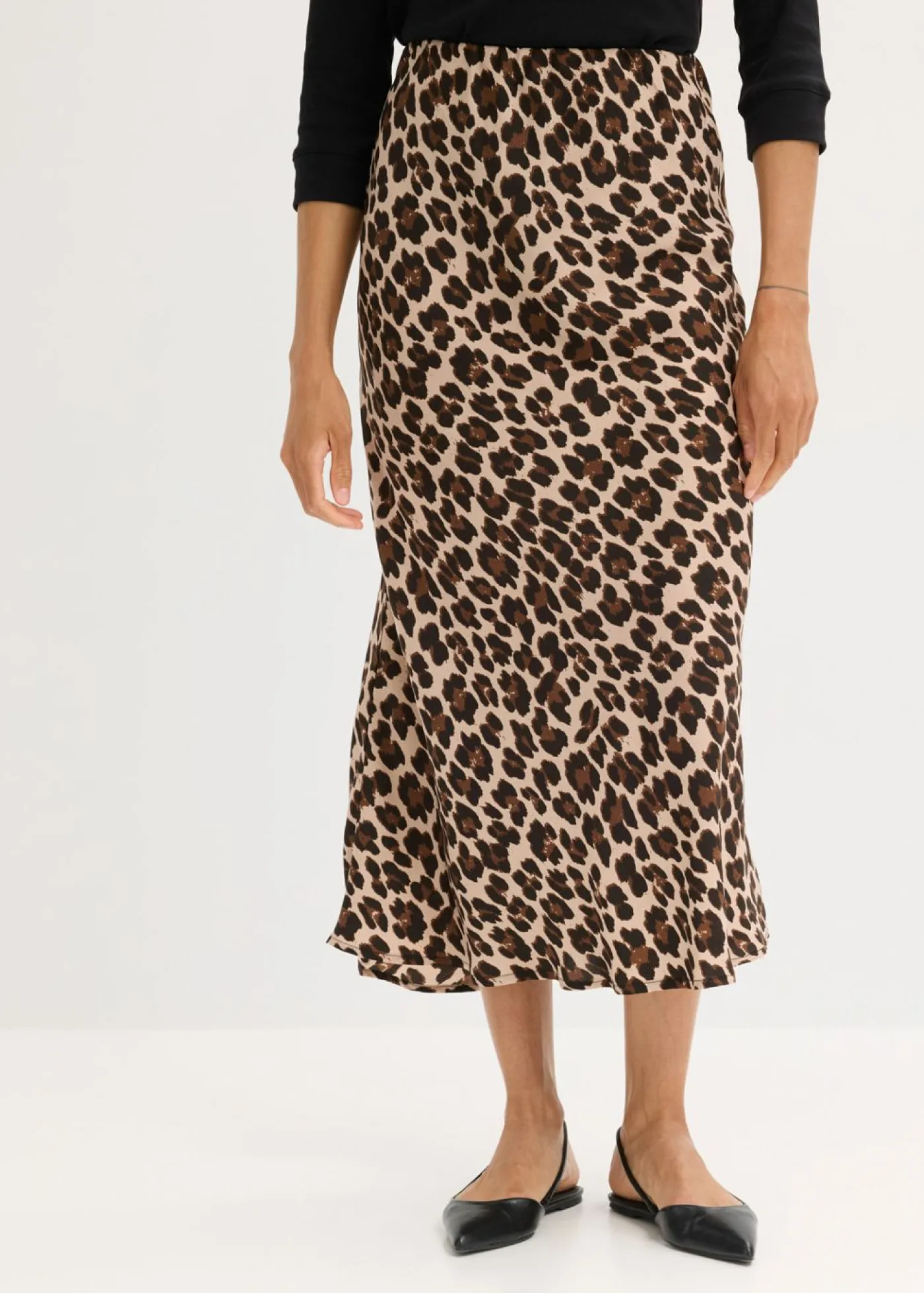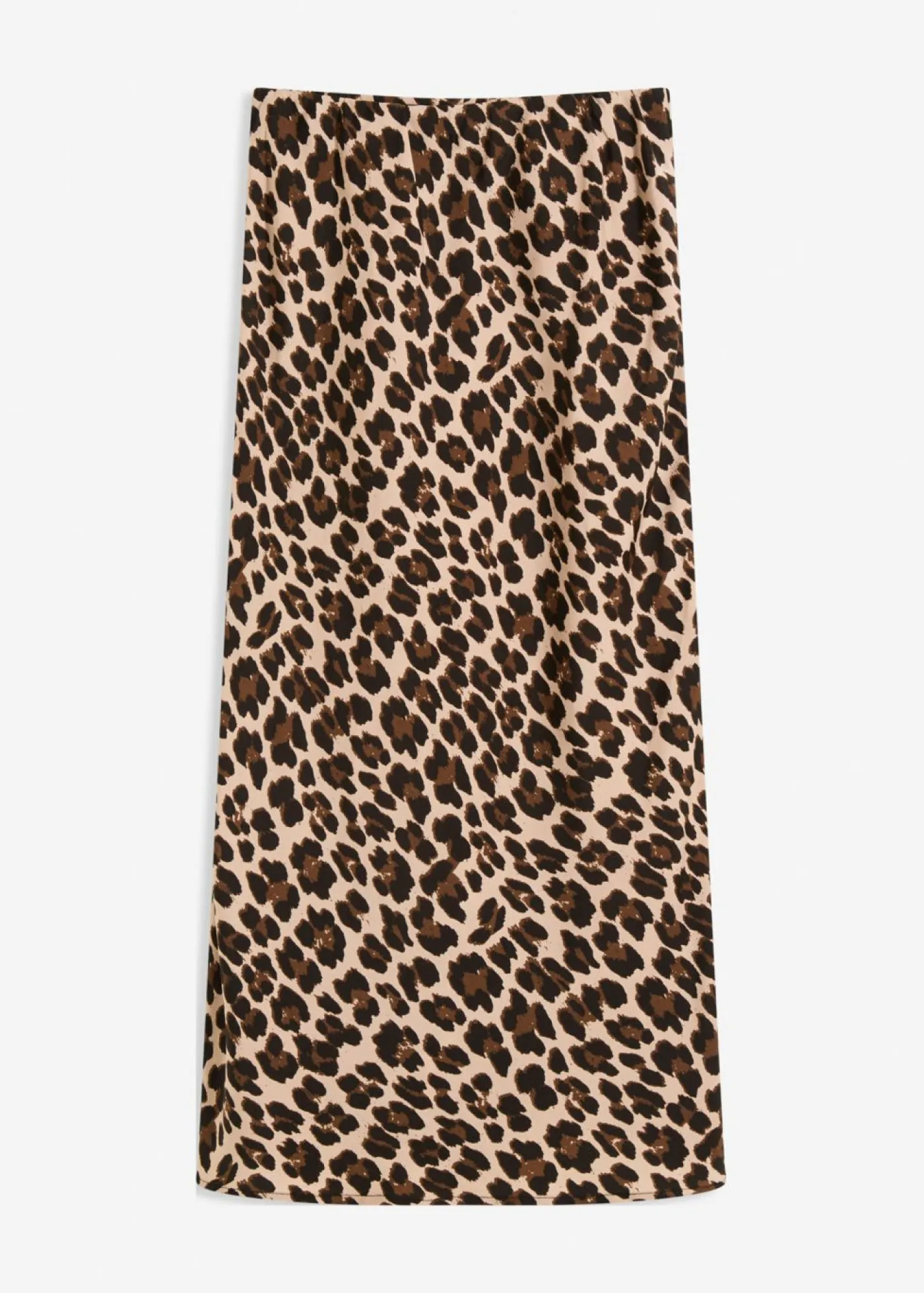 Falda de satén fluido con estampado moderno, largo midi y cinturilla elástica.