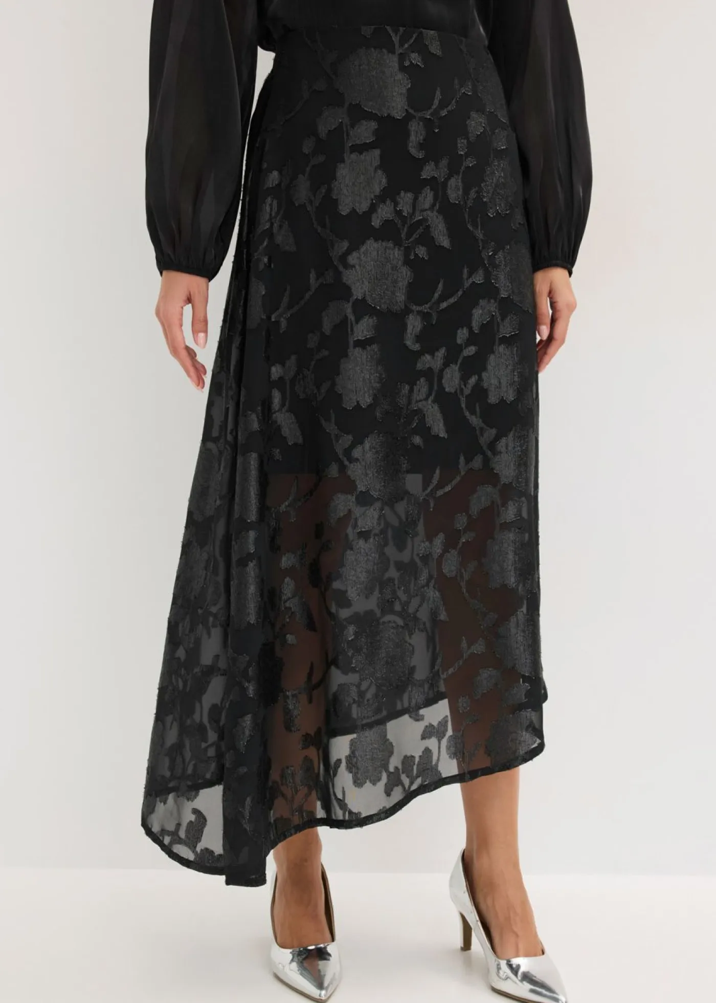 Moderno y femenino: Falda larga con bordado brillante y dobladillo asimétrico.