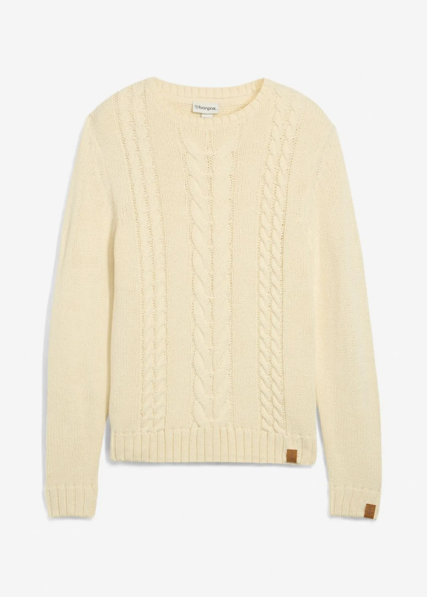 Bonito jersey con diseño trenzado, cuello redondo y detalles de piel sintética.