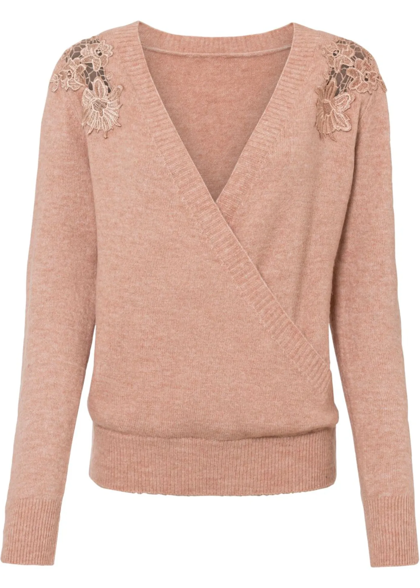 Cómodo jersey con inserto de encaje. Con botón de presión en el escote.