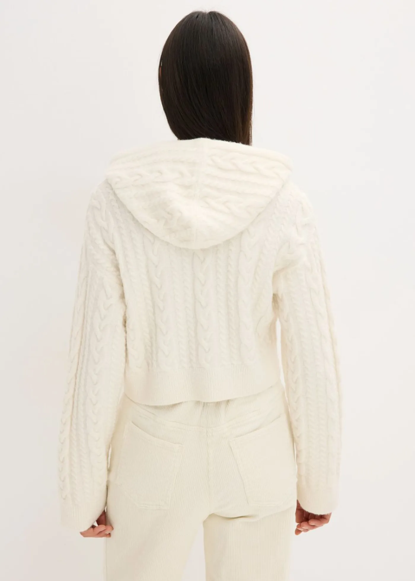 Jersey moderno de punto grueso con capucha y patrón trenzado.