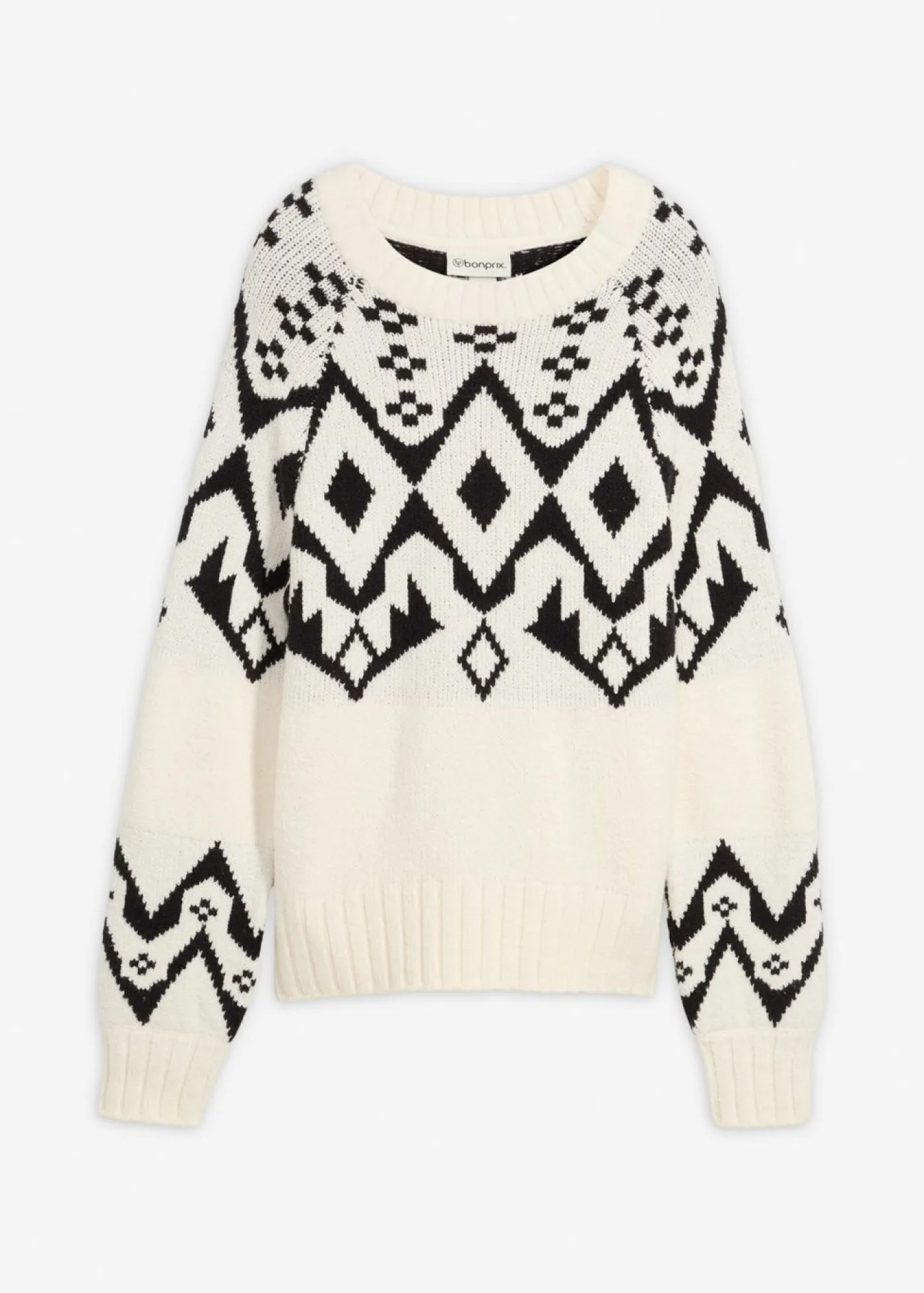 Moderno jersey oversize de estilo noruego con diseño monocromático.
