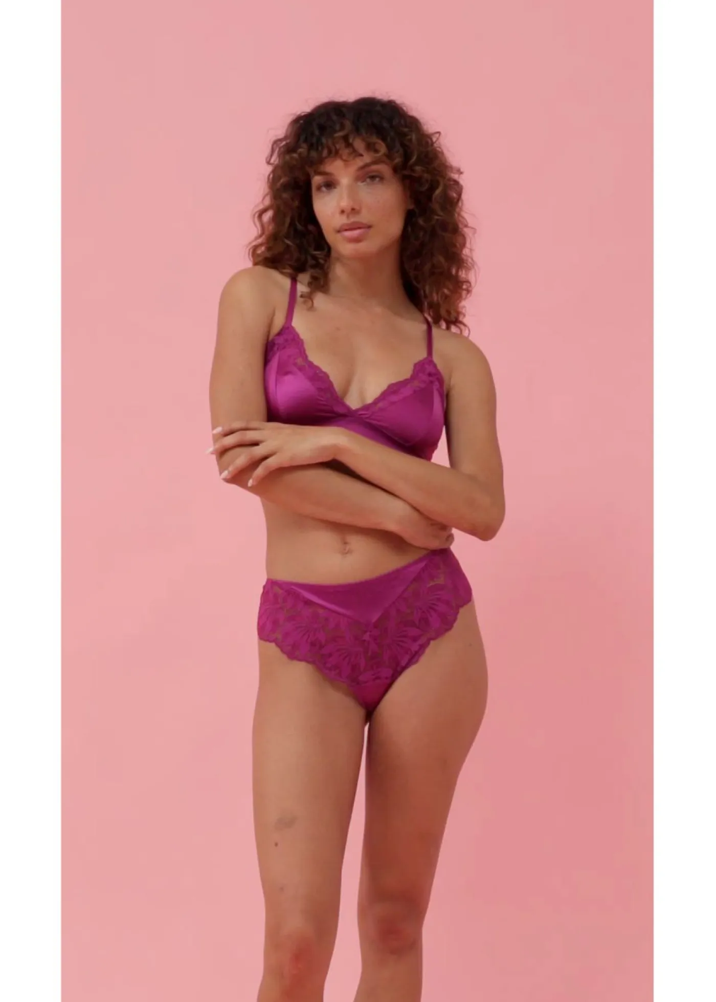 Bralette de material brillante con encaje decorativo.