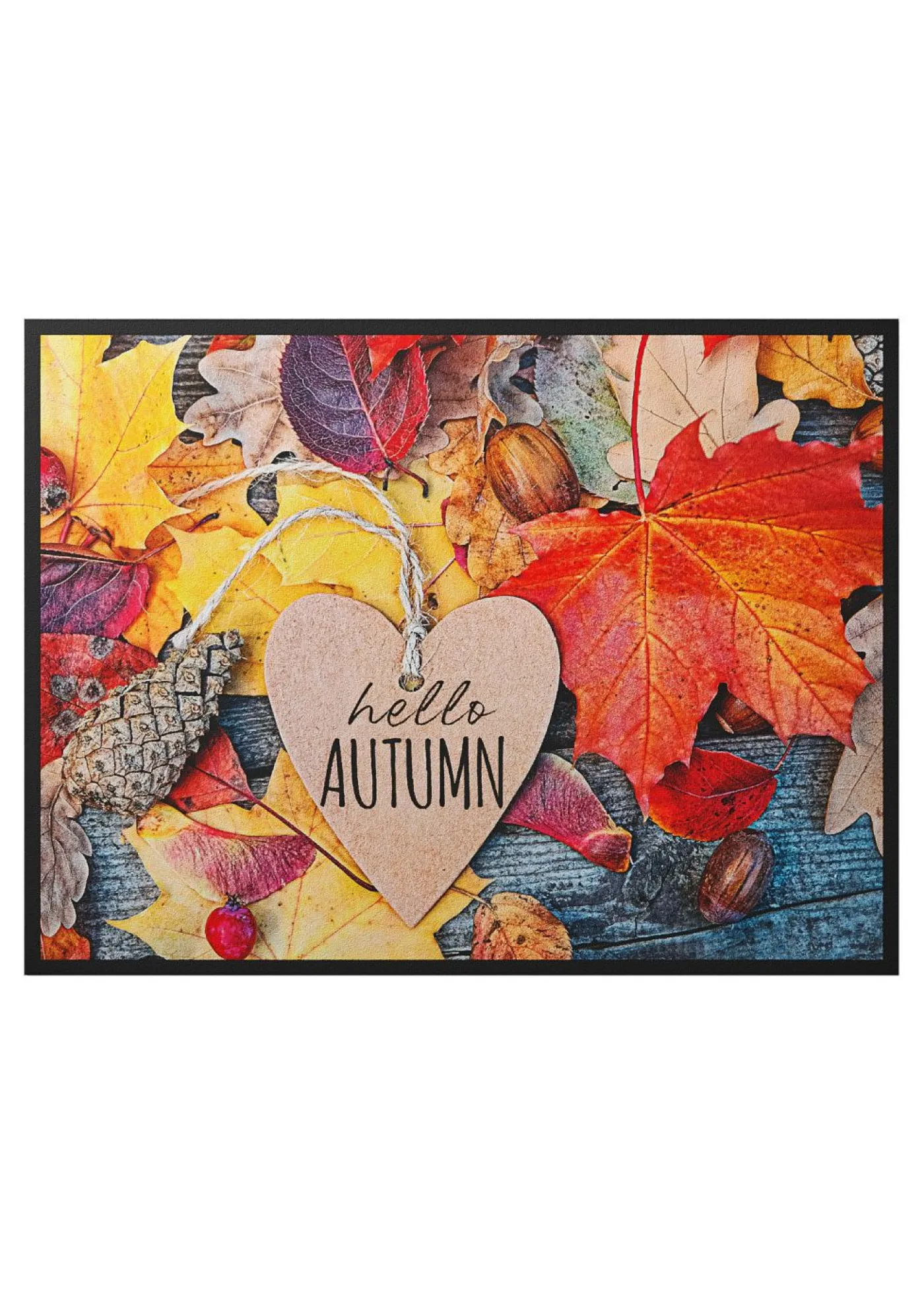 Ambiente otoñal dorado en la entrada. Bonito felpudo con estampado otoñal de calidad resistente y revestimiento antideslizante en la parte posterior.
