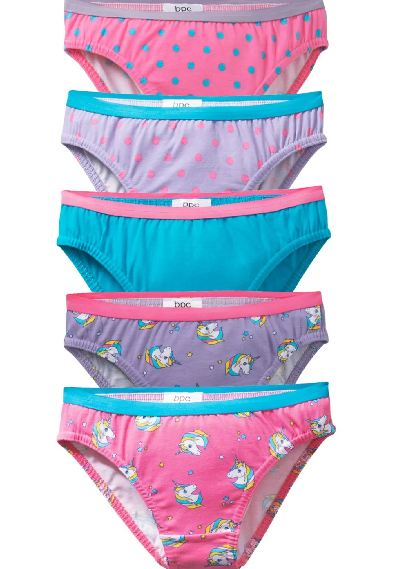 Braguitas en un práctico envase con 5 unidades. 4 con un precioso estampado y 1 de un solo color. Estas braguitas combinan perfectamente con bustiers y tops.