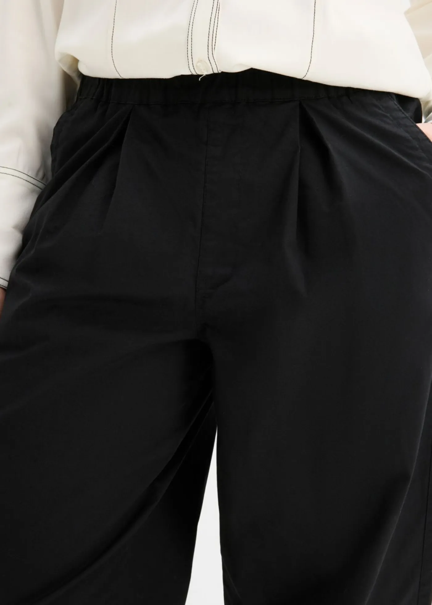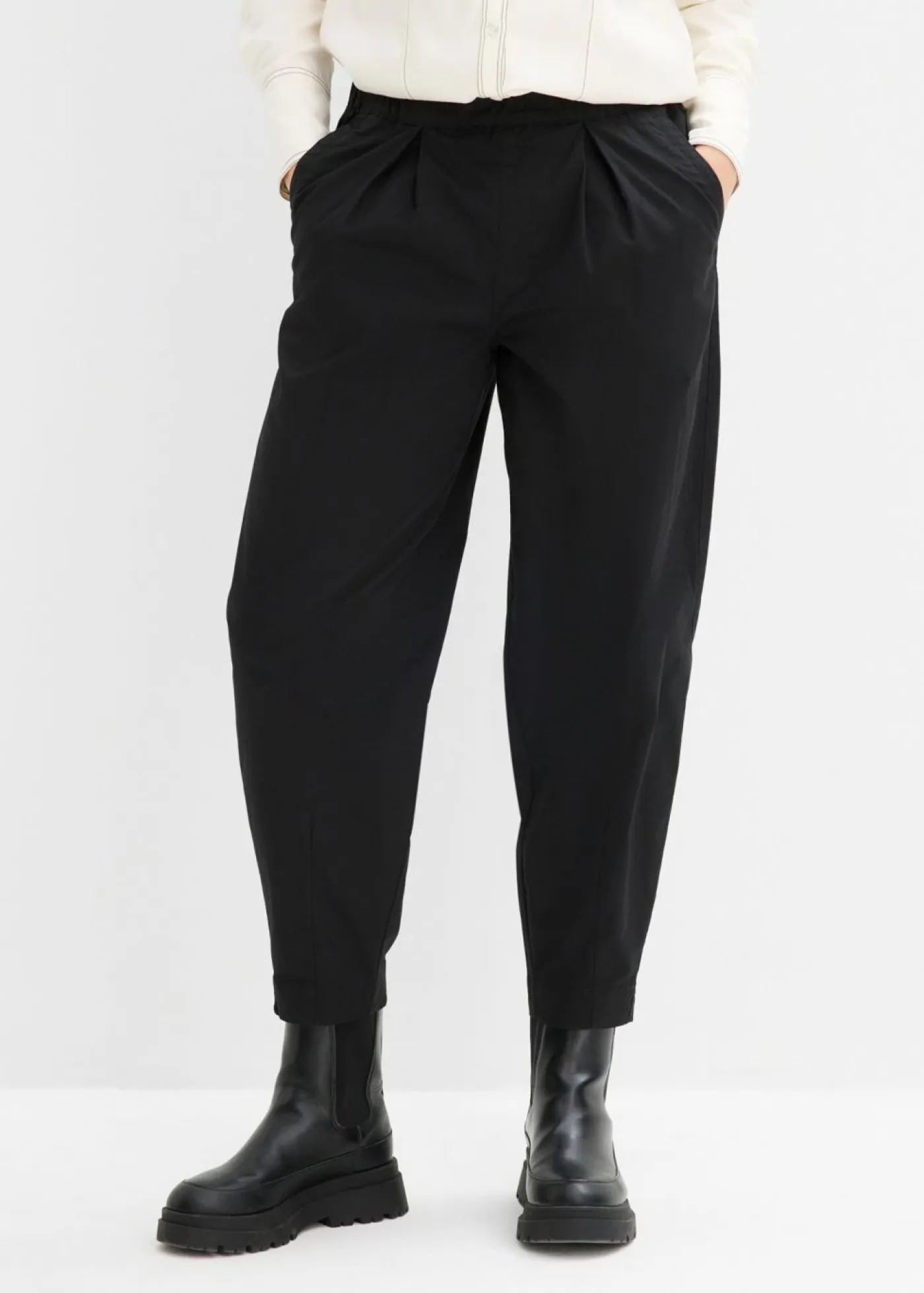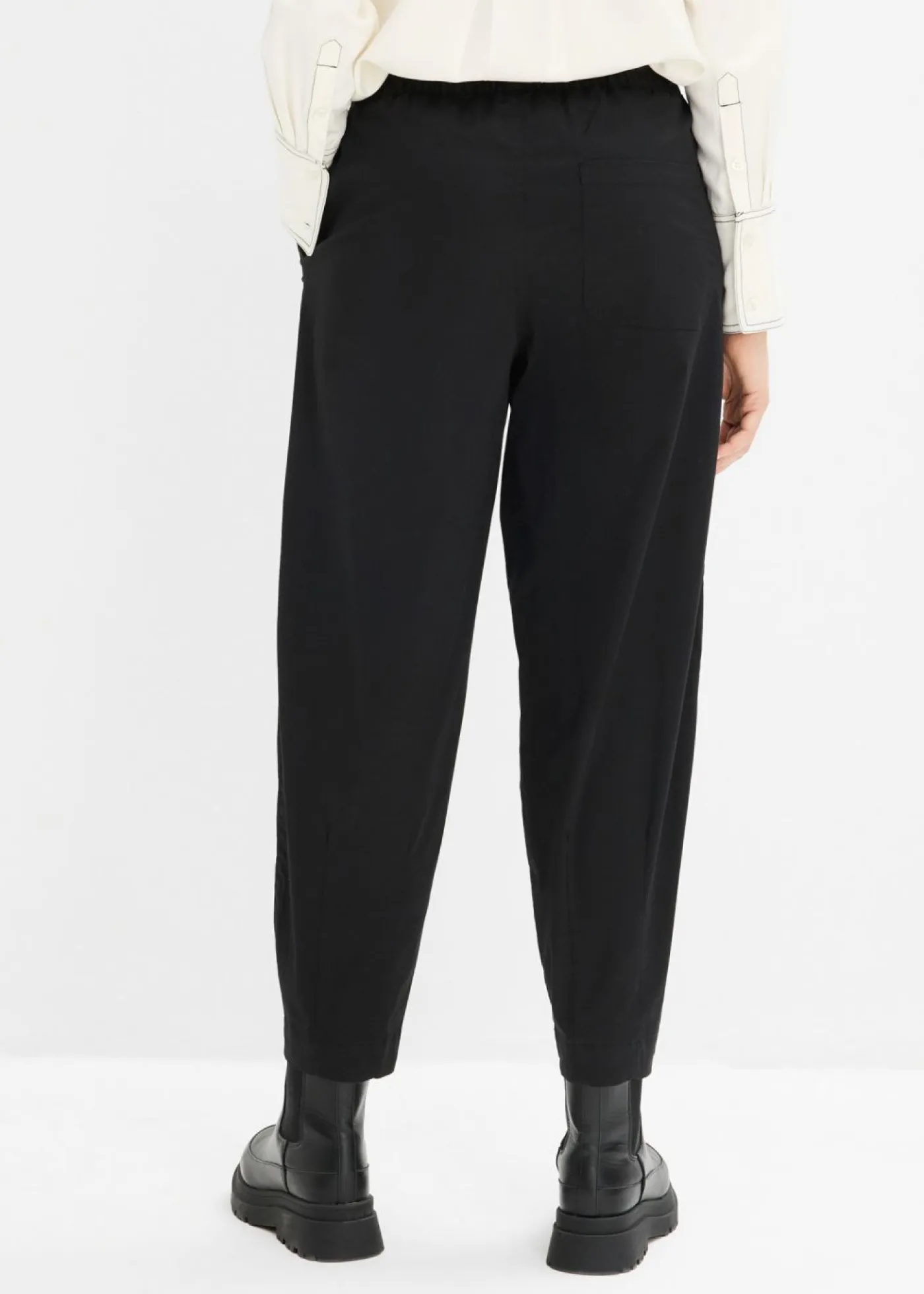 Pantalón con corte amplio y ajuste barrel. Con cintura elástica con ajuste individual. Largo interior de la pierna de aprox. 62 cm en talla 42. Se puede lavar a máquina.