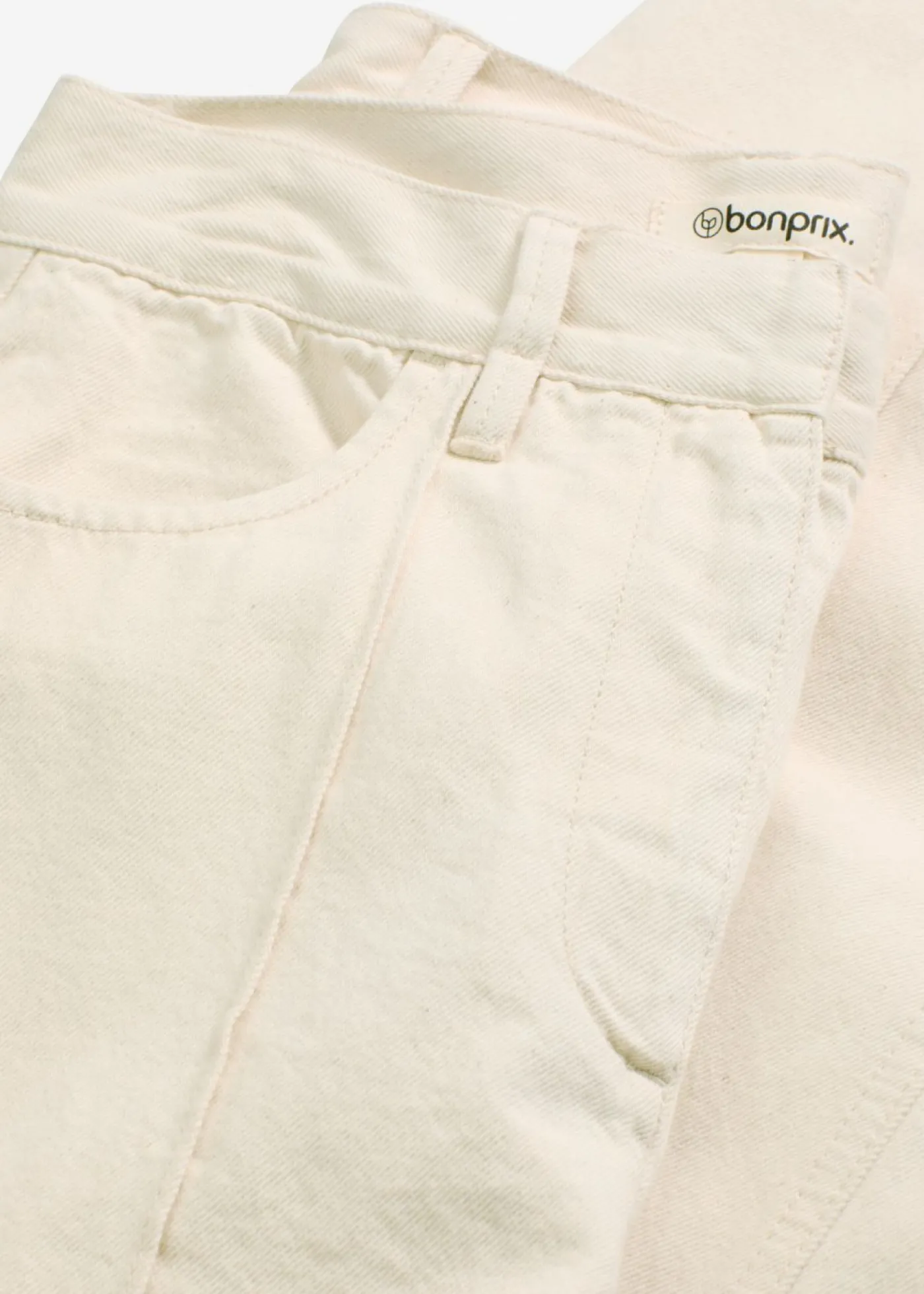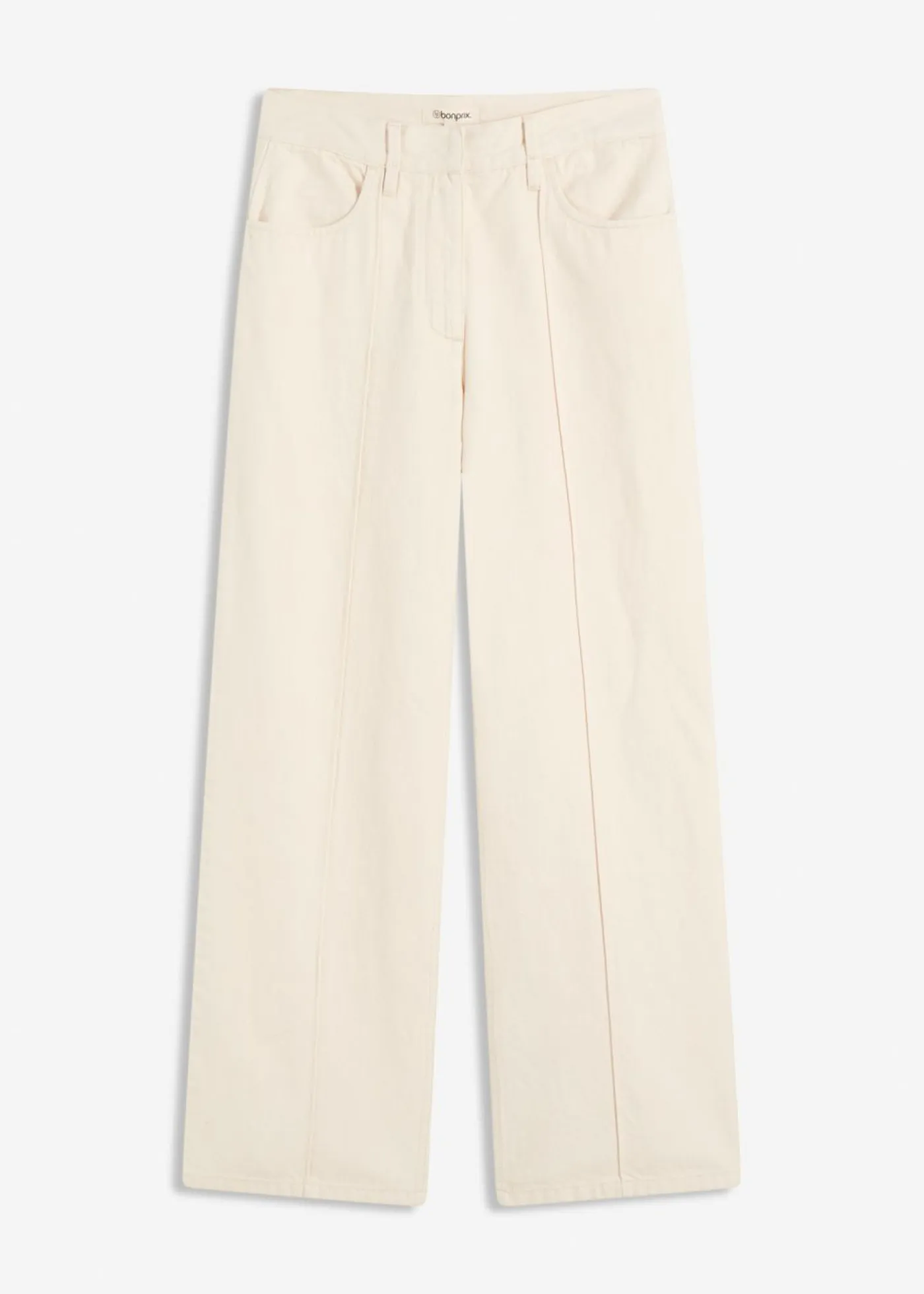 Pantalón informal de sarga con perneras anchas y bolsillos laterales.