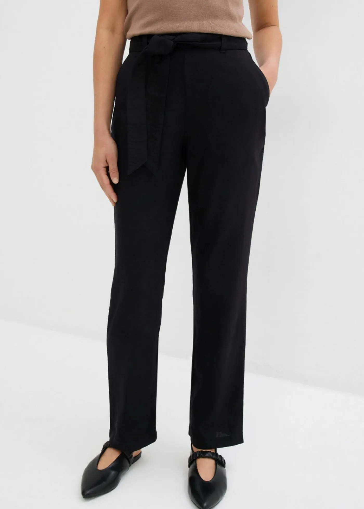 Pantalón de mezcla vaporosa de lino y viscosa con dos bolsillos en la parte delantera. La cinturilla se adapta con total flexibilidad. Con el cinturón adecuado. Largo interior de la pierna de aprox. 74,5 cm en talla 42. Se puede lavar a máquina.
