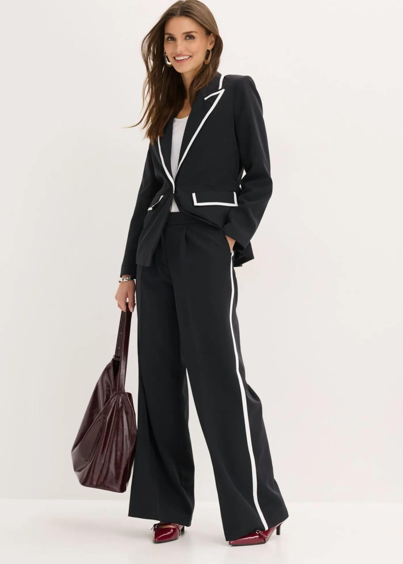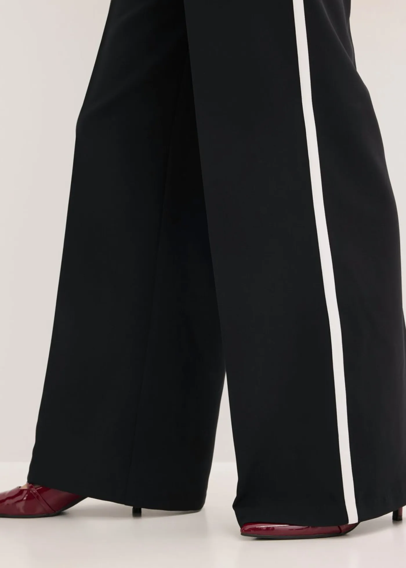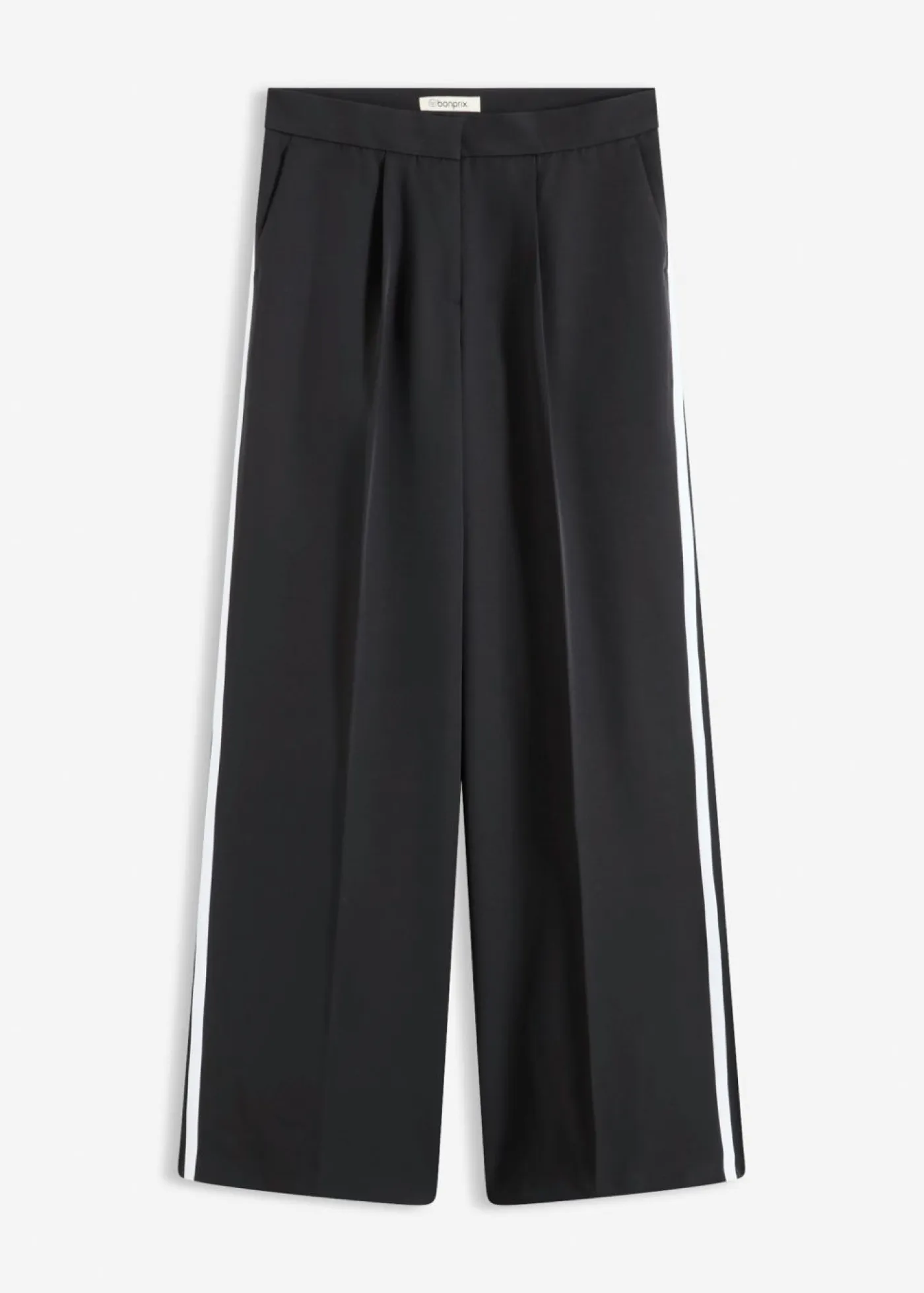 Pantalón moderno de estilo palazzo con pliegues en la parte delantera y trasera, así como ribetes decorativos en la costura lateral.