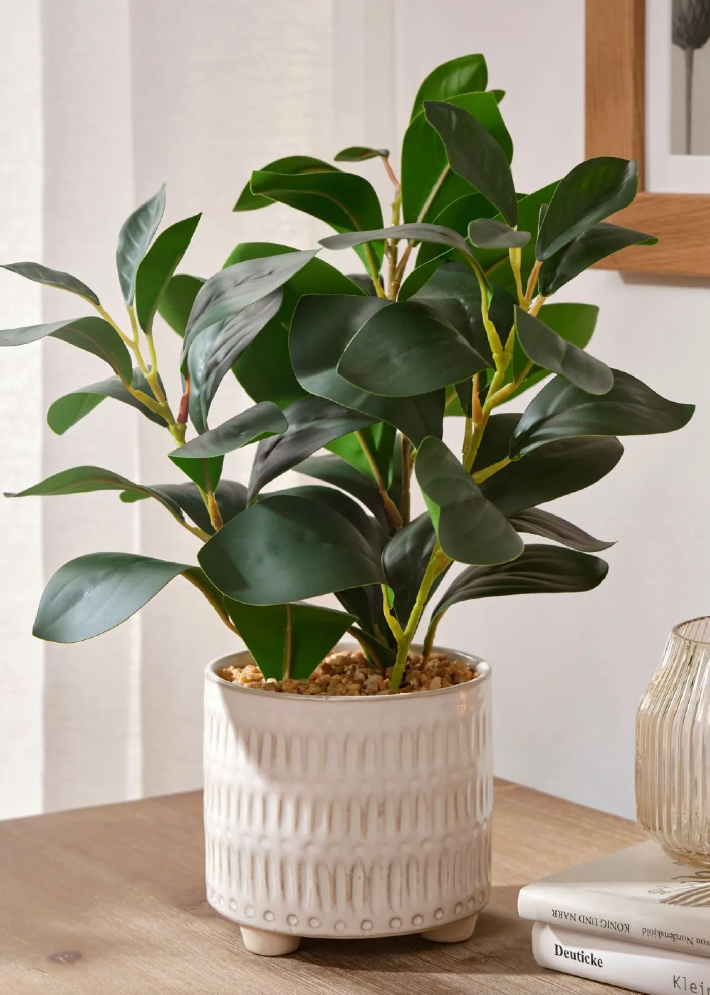 Planta artificial de hoja perenne, especialmente duradera y fácil de cuidar. Decoración siempre verde y fácil de cuidar. Fiel a la naturaleza. Especialmente adecuada para habitaciones con poca luz natural, como el cuarto de baño. La entrega incluye la maceta.