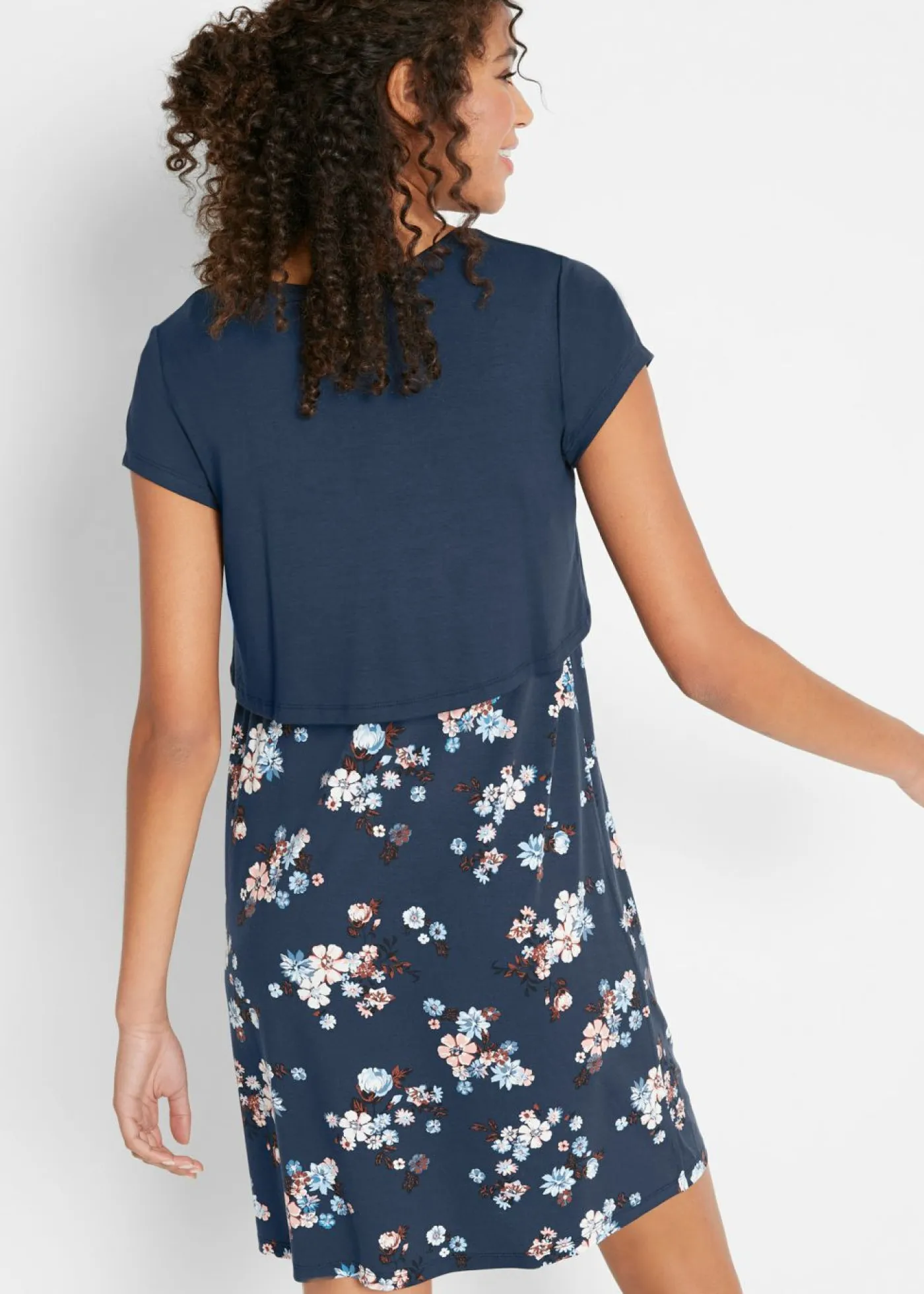 Vestido veraniego para el embarazo y después, con función de lactancia. Vestido de punto de viscosa elástica de manga corta. Con cuello redondo y mangas cortas. El diseño de doble capa ayuda a evitar la pérdida de calor y permite una lactancia cómoda tanto para la madre como para el bebé.