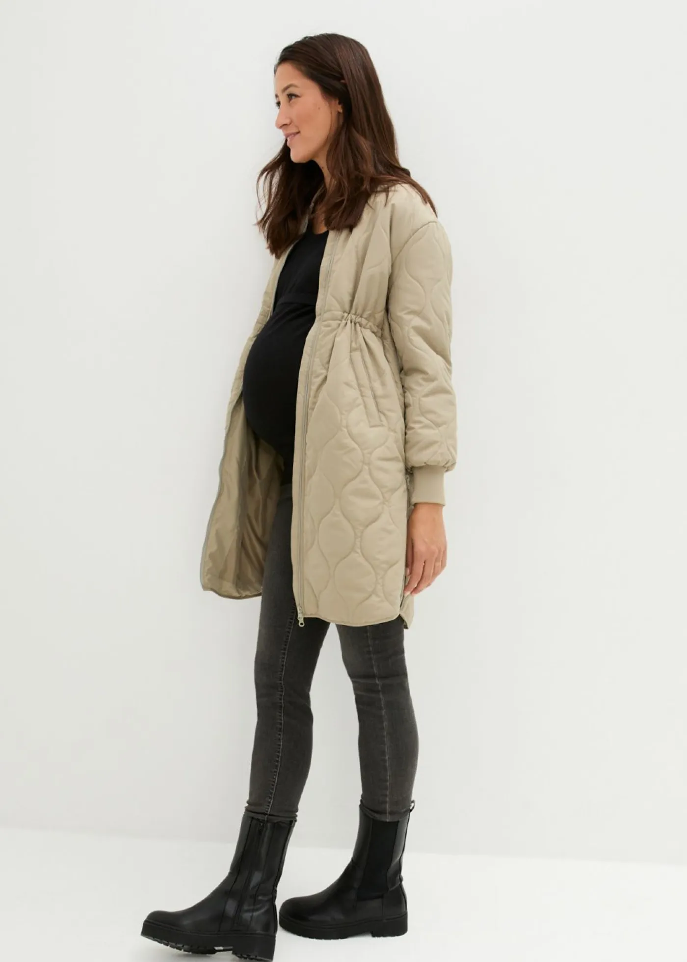Abrigo guateado de entretiempo para durante y después del embarazo. Abrigo con ligero guateado y cremalleras laterales para regular la anchura: ideal para usar durante y después del embarazo. Equipado con un inserto de porteo con capucha para el bebé. Las mangas y el cuello cuentan puños elásticos suaves para brindar mayor comodidad.