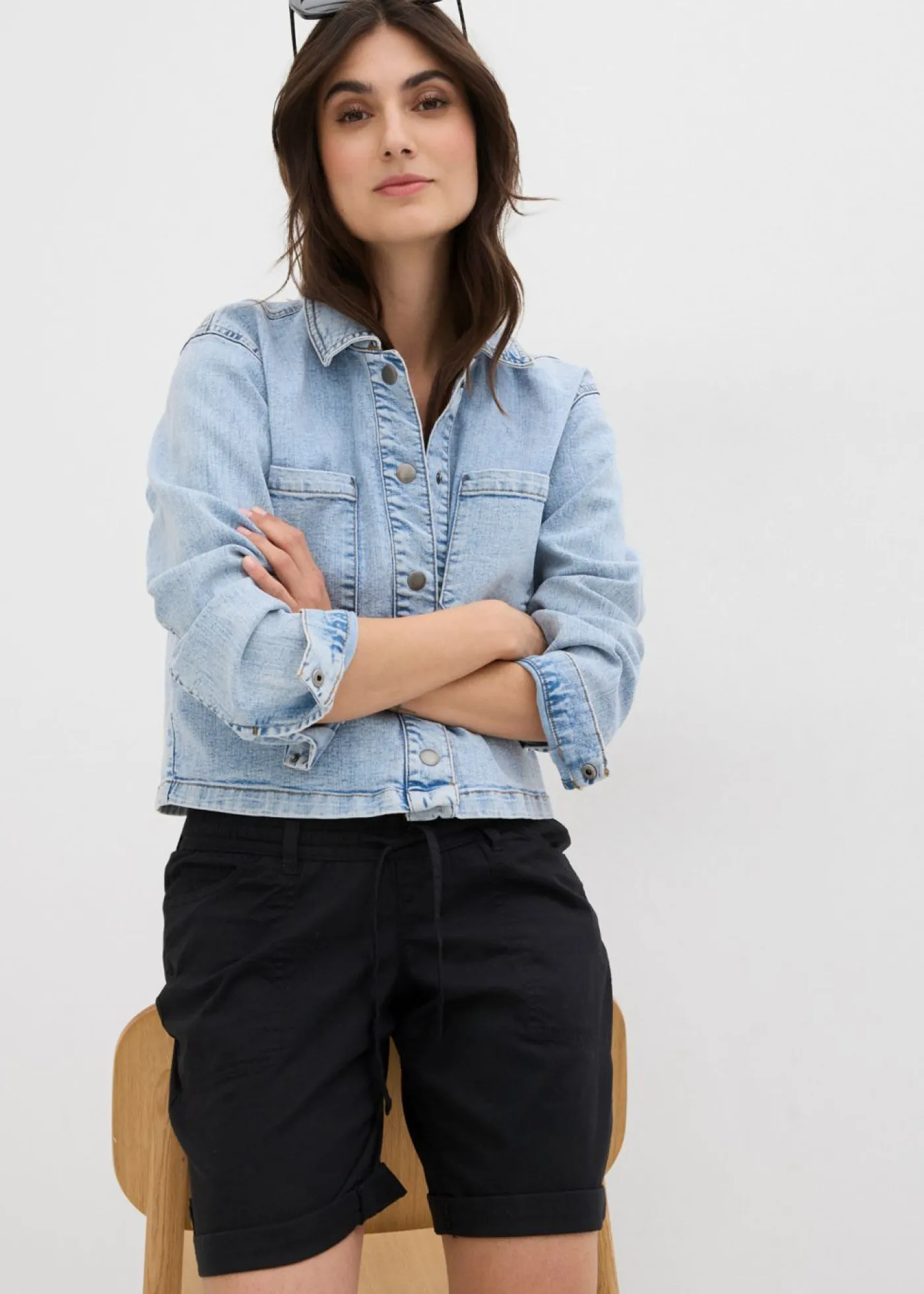 Pantalón premamá con dos largos diferentes. Pantalón corto para el embarazo confeccionado en cómodo tejido de algodón elástico. La cinturilla elástica con cordón ajustable y trabillas garantiza un ajuste cómodo que se adapta al vientre en crecimiento. El pantalón cuenta con una presilla y un botón para remangar las perneras para convertirlo en uno pantalón corto. Por ello, puedes llevarlo como unas bermudas holgadas o como un pantalón corto en los días más calurosos. Con prácticos bolsillos en la parte delantera y bolsillos con solapa en la parte trasera.