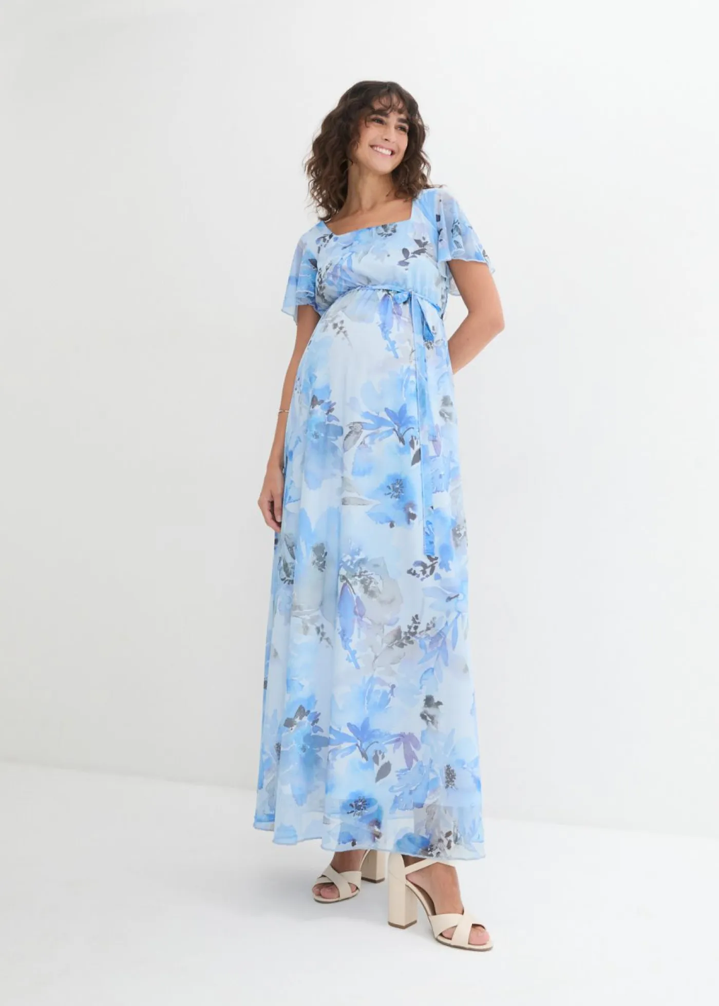 Vestido largo estampado para ocasiones especiales durante el embarazo. Vestido premamá largo de malla elástica con forro suave. Con escote rectangular, delicadas mangas de murciélago y cordón desmontable. La costura elástica debajo del pecho y la falda en ligera línea en A crean una silueta favorecedora y ofrecen una gran comodidad. El delicado aspecto de malla aporta un toque romántico, mientras que el estampado de flores en acuarela aporta una elegancia divertida.