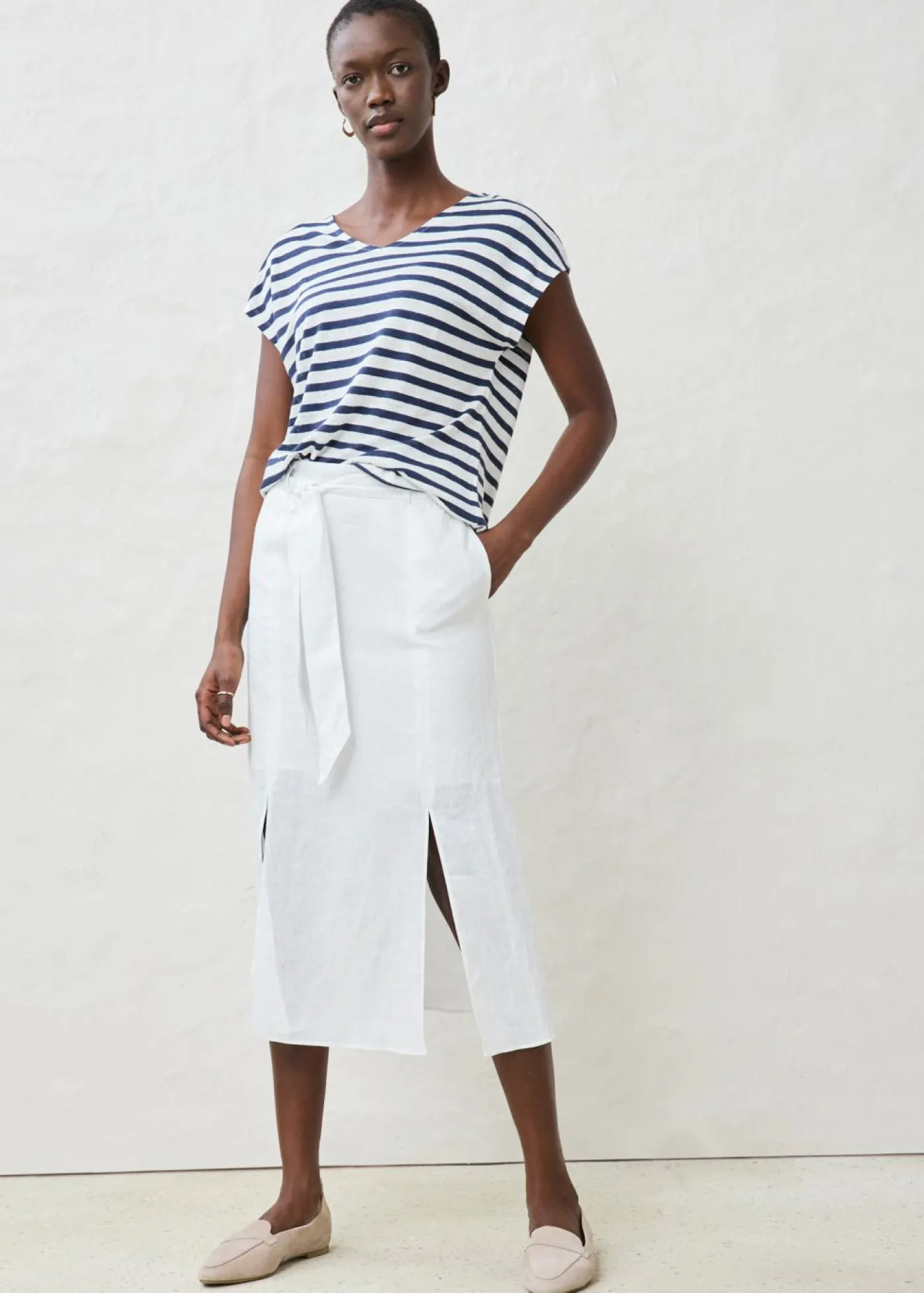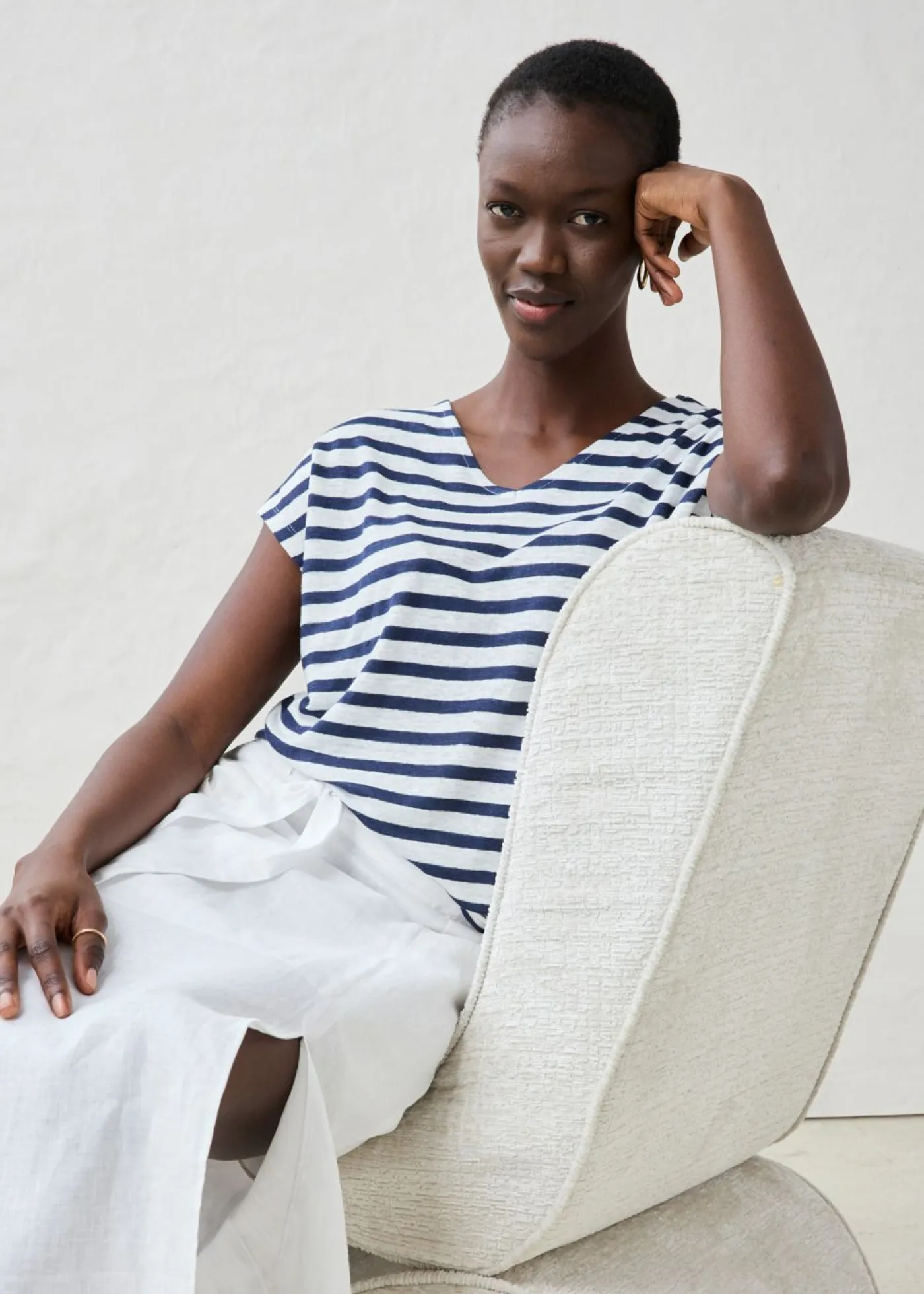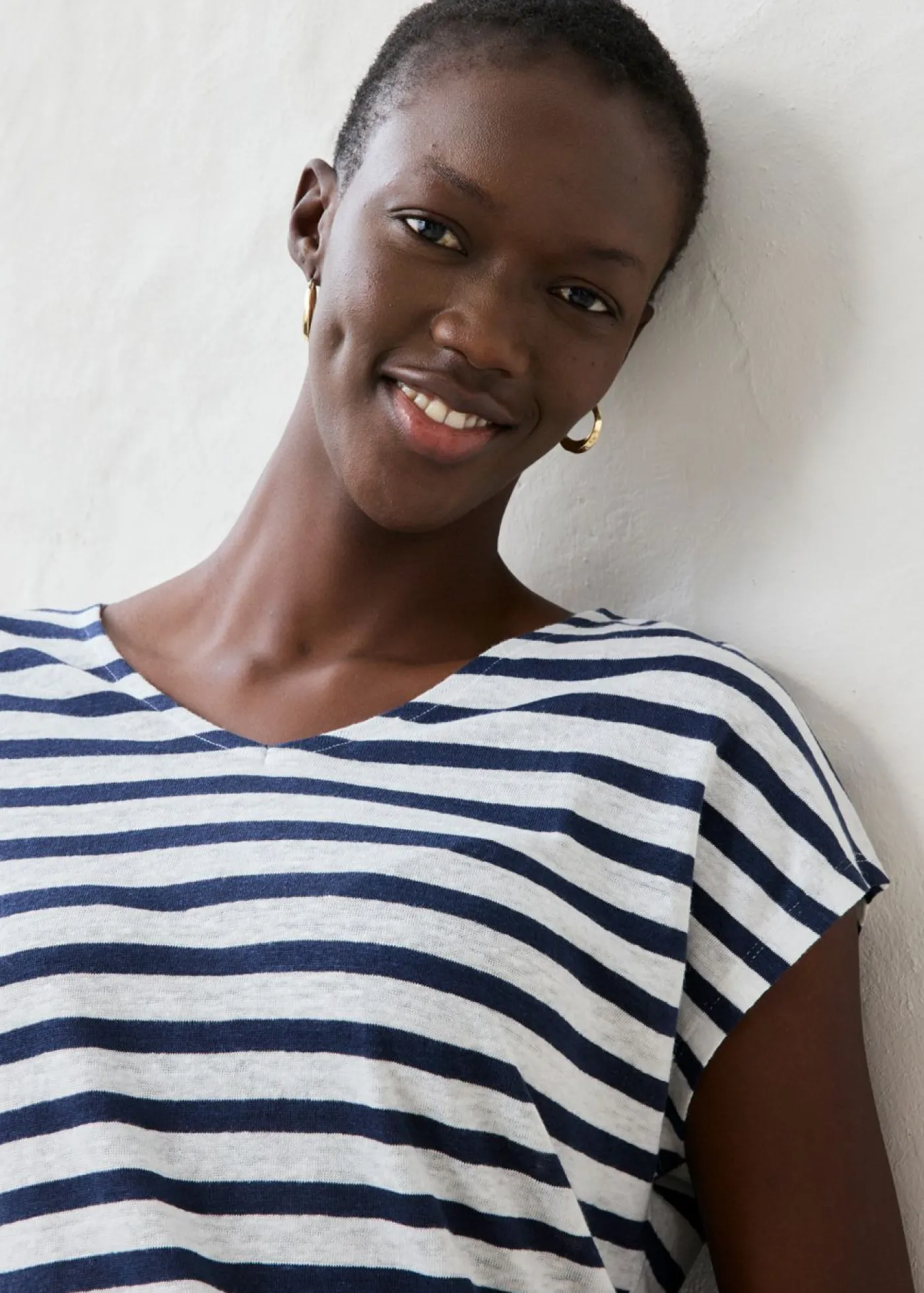 Camiseta de lino con diseño de rayas y escote en V en la parte delantera y trasera. El lino es una fibra natural resistente y, gracias a sus propiedades fibrosas, transpira la piel. Se caracteriza por los finos pliegues y la superficie estructurada. Agradable y vaporoso, el lino será tu compañero ideal para el verano.