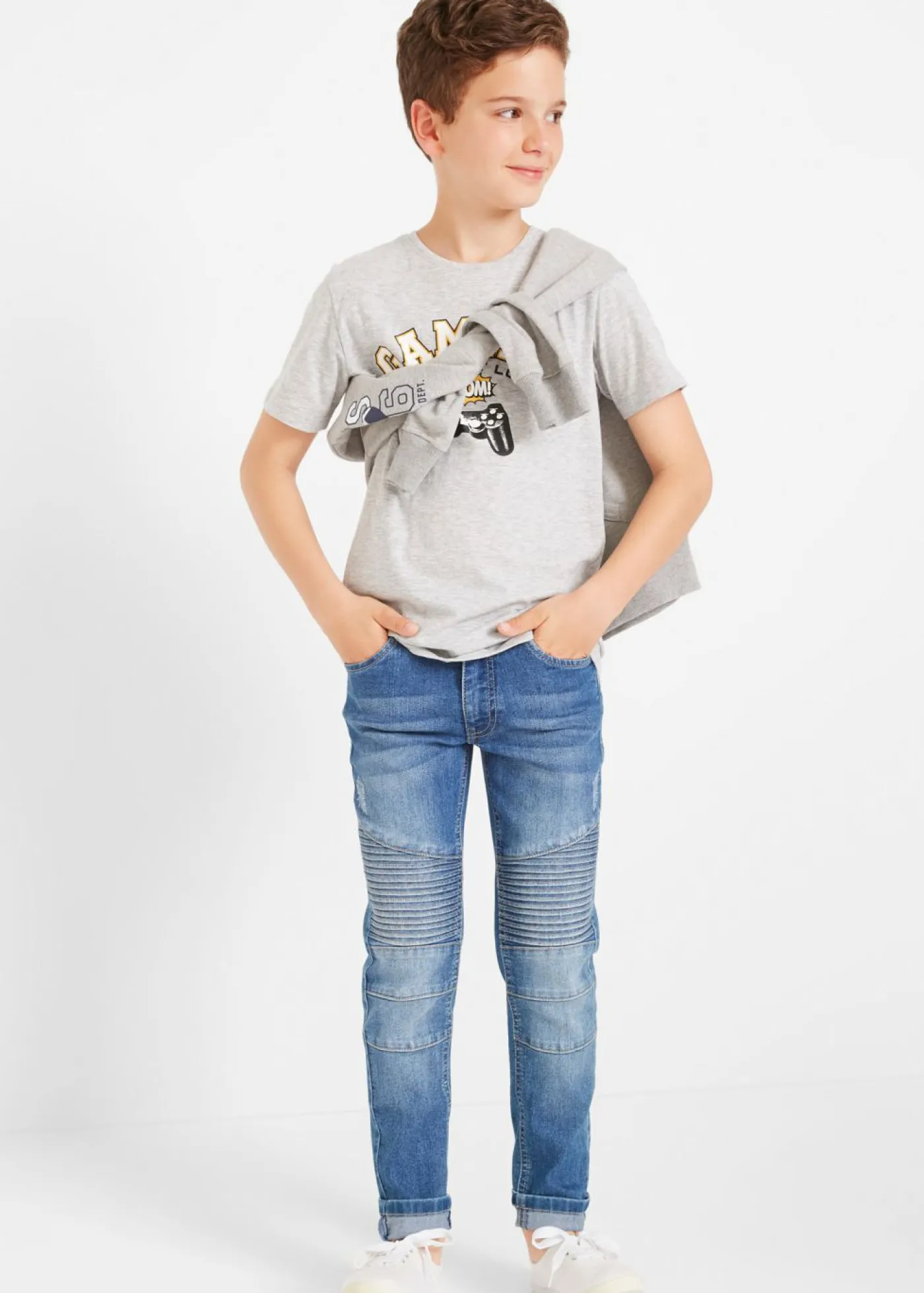 Modernos vaqueros pitillo con estilo de 5 bolsillos y costuras acolchadas para niños. Vaqueros elásticos con corte pitillo, estilo de 5 bolsillos y acolchados en el muslo. La cintura se puede ajustar individualmente en todas las tallas.