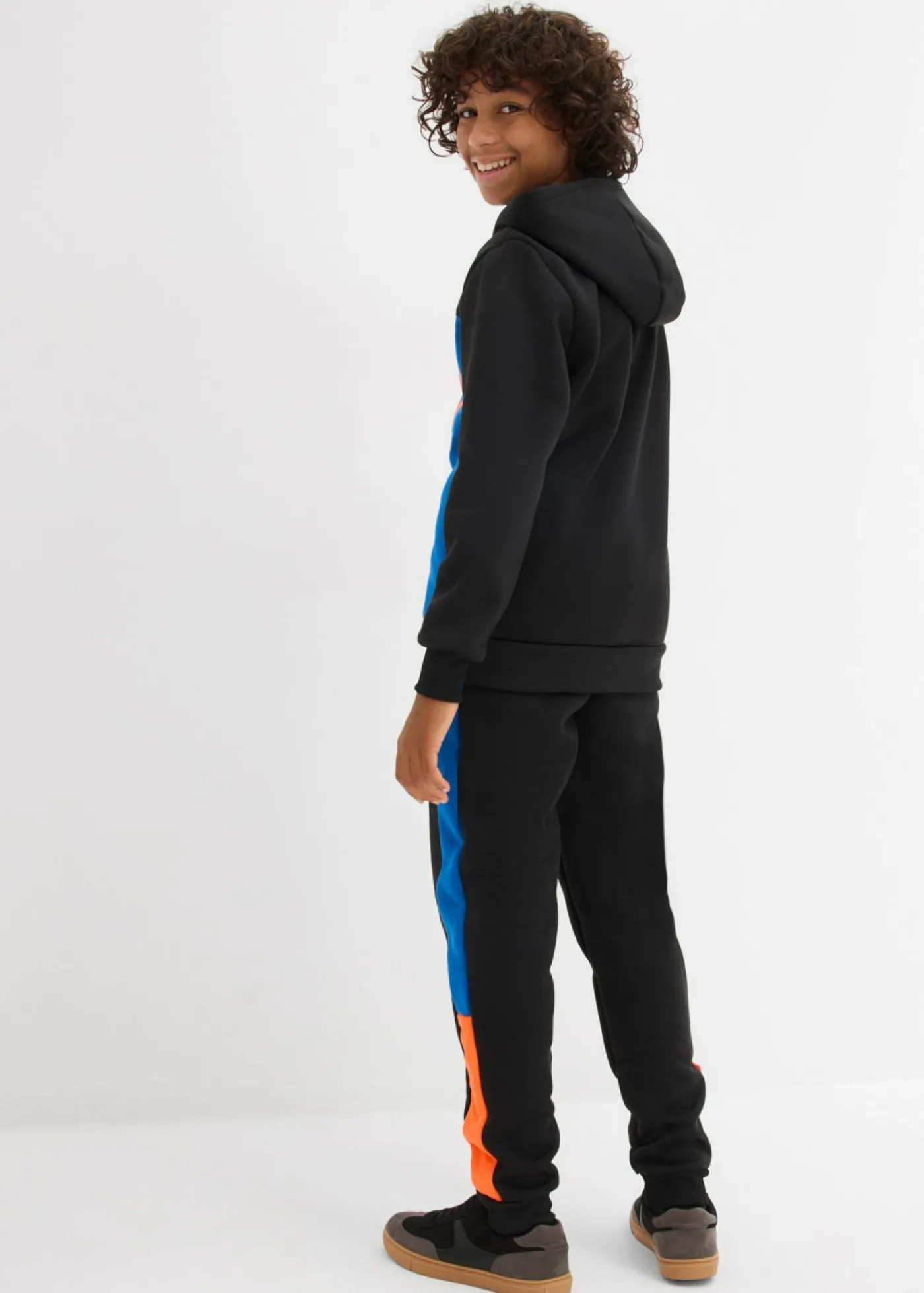 Chándal moderno con estampado para niños. Este chándal es perfecto para las actividades deportivas. Los grandes detalles de colores en contraste y sus estampados hacen que esta prenda atraiga todas las miradas. El corte atlético, la práctica capucha y los bolsillos tipo canguro confieren al conjunto un nivel de confort excepcional.
