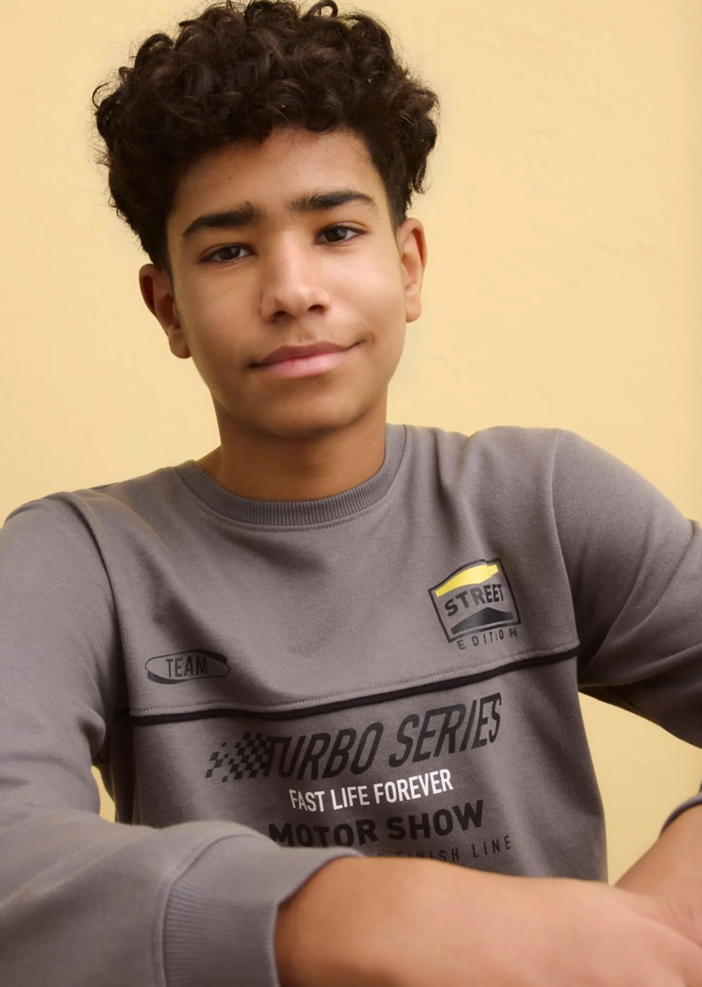 Sudadera de cuello redondo para niño con motivo de carreras.
