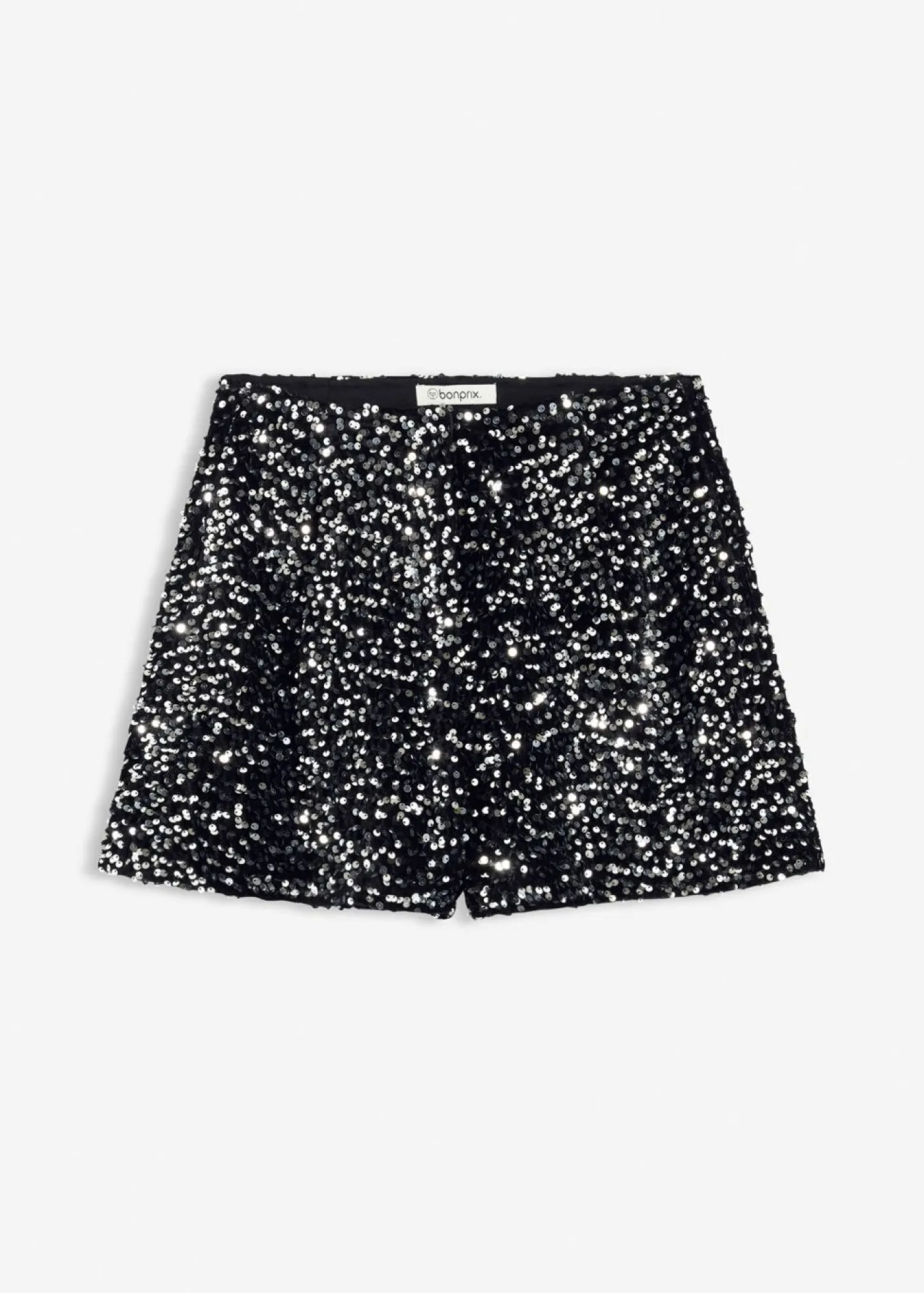 Pantalón corto de lentejuelas con cierre de ojales en la parte delantera.