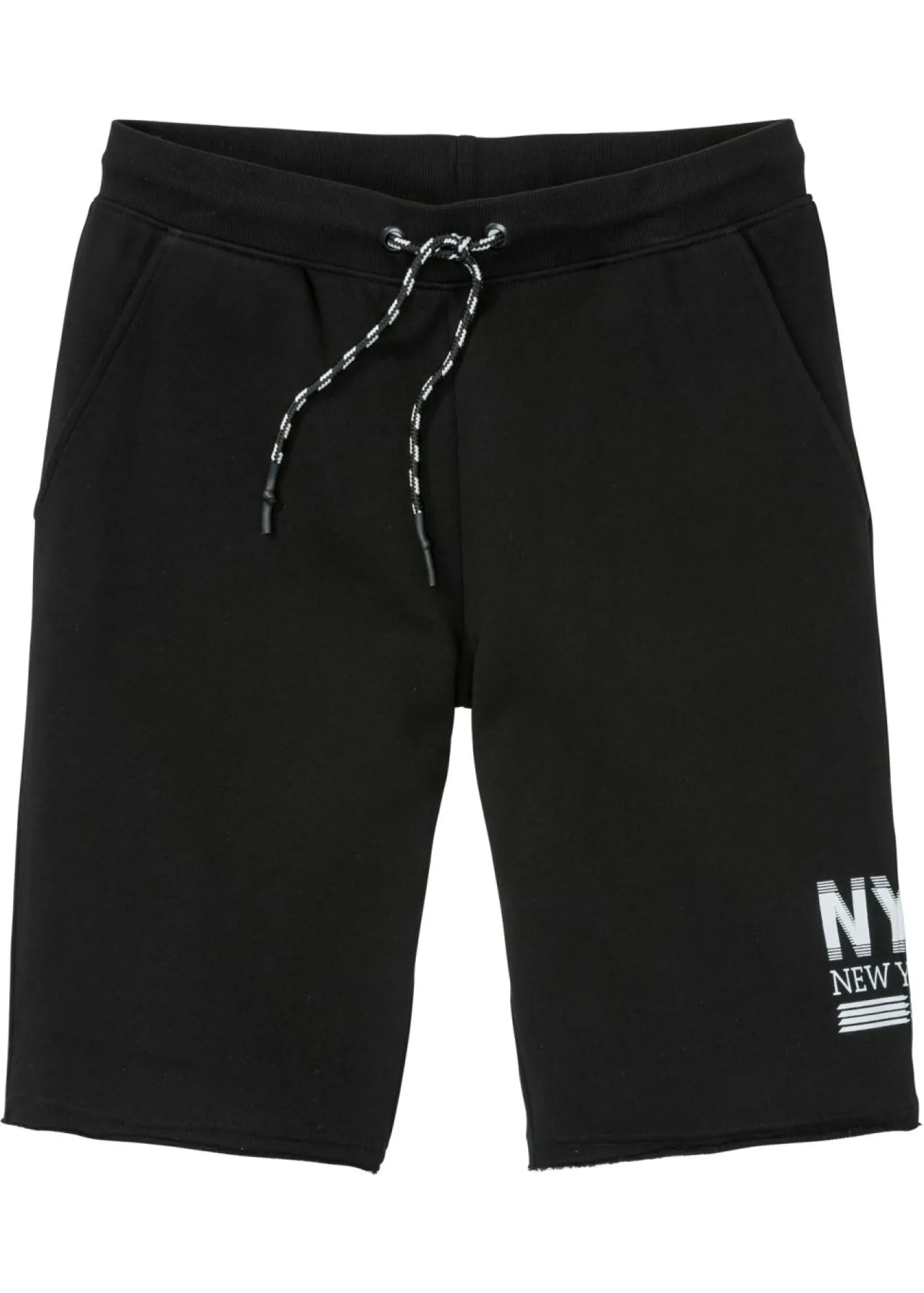 Bermuda de chándal con un pequeño estampado y bordes abiertos en la pernera. Con cordón.
