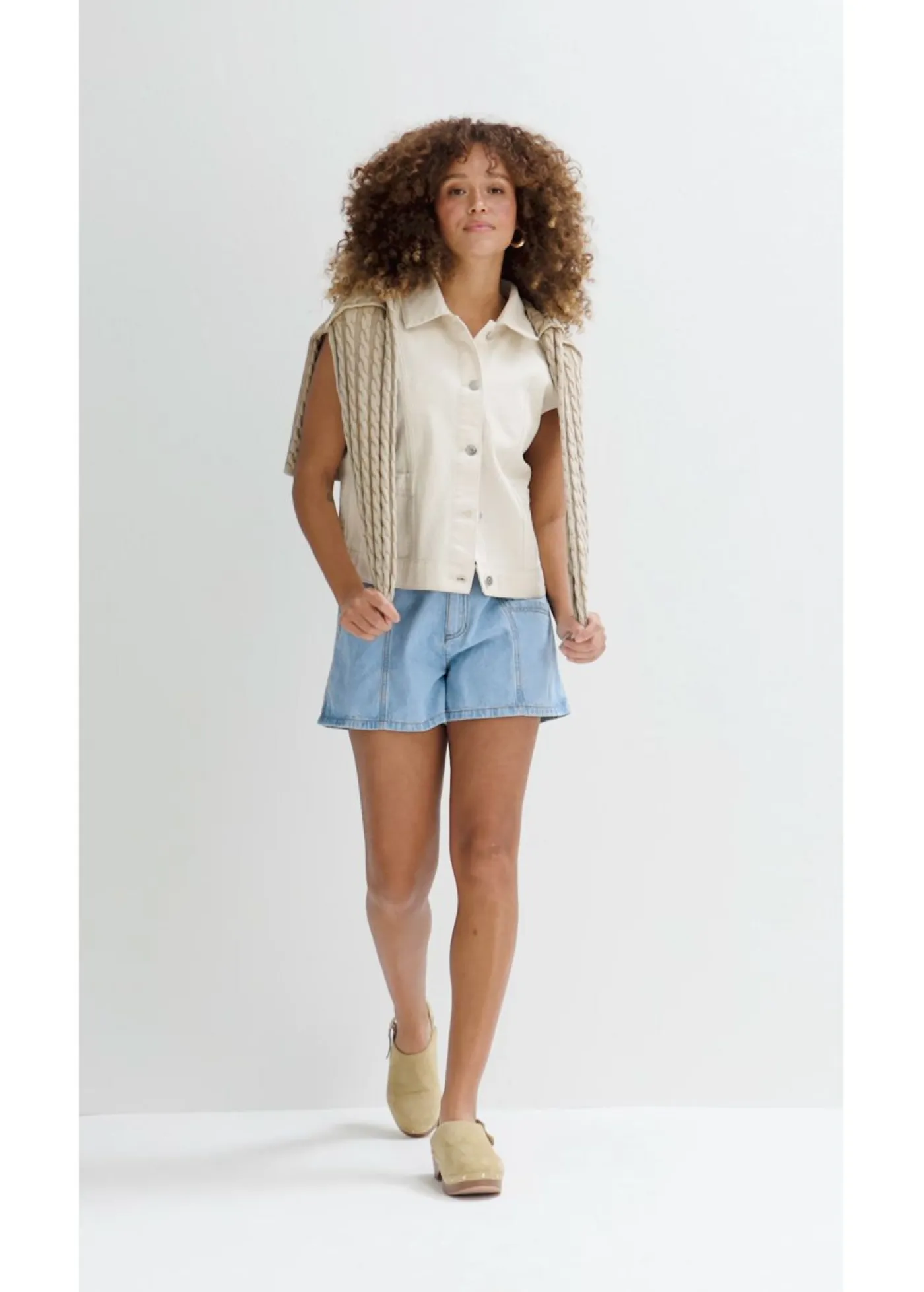 Vaqueros cortos anchos con cinturilla elástica. Vaqueros cortos holgados de 5 bolsillos con cintura elástica de cuentas, confeccionados en un tejido vaquero de algodón firme que al principio resulta un poco rígido, pero que se vuelve más suave y suelto con el uso frecuente. Cintura de talle alto. Largo interior de la pierna de aprox. 10,5 cm en talla 42. Se puede lavar a máquina.