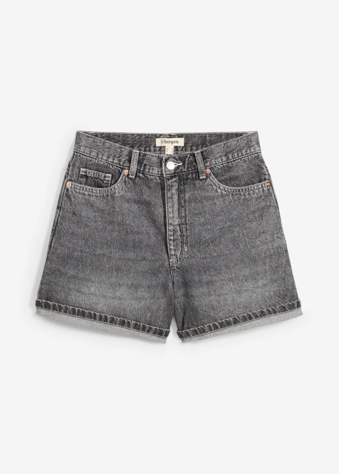 Vaqueros cortos de cintura alta. Vaqueros cortos de 5 bolsillos confeccionado en un tejido vaquero de algodón firme que se siente un poco rígido al principio y se vuelve más suave y suelto con el uso frecuente. Cintura alta con bragueta de cremallera y botón. Dobladillo doble. Largo interior de la pierna de aprox. 11,5 cm en talla 42. Se puede lavar a máquina.